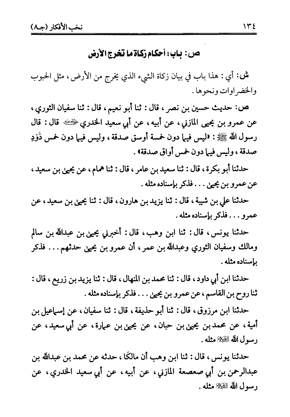 ص: حديث حسين بن نصر، قال: ثنا أبو نعيم، قال: ثنا سفيان الثوري، عن عمرو بن يحيى المازني، عن أبيه، عن أبي سعيد الخدري - رضي الله عنه - قال: قال رسول الله - صلى الله عليه وسلم -: "ليس فيما دون خمسة أوسق صدقة، وليس فيما دون خمس ذَوْدٍ صدقة، وليس فيما دون خمس أواق صدقة".