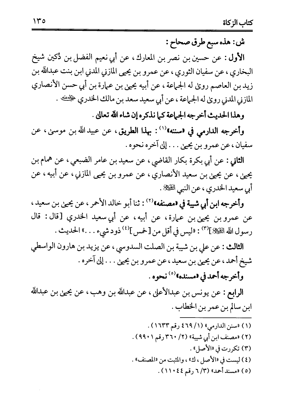 الأول: عن حسين بن نصر بن المعارك، عن أبي نعيم الفضل بن دُكين شيخ البخاري، عن سفيان الثوري، عن عمرو بن يحيى المازني المدني ابن بنت عبد الله بن زيد بن العاصم روى له الجماعة، عن أبيه يحيى بن عمارة بن أبي حسن الأنصاري المازني المدني روى له الجماعة، عن أبي سعيد سعد بن مالك الخدري - رضي الله عنه -.