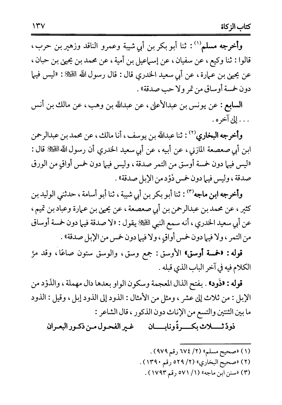 وأخرجه البخاري (¬2): ثنا عبد الله بن يوسف، أنا مالك، عن محمَّد بن عبد الرحمن ابن أبي صعصعة المازني، عن أبيه، عن أبي سعيد الخدري أن رسول الله - عليه السلام - قال: "ليس فيما دون خمسة أوسق من التمر صدقة، وليس فيما دون خمس أواقٍ من الورق صدقة، وليس فيما دون خمس ذَوْد من الإبل صدقة".