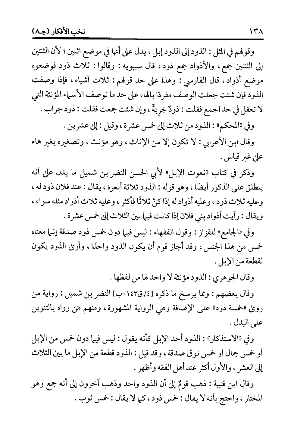 وقال ابن قتيبة: ذهب قومٌ إلى أن الذود واحد وذهب آخرون إلى أنه جمع وهو المختار، واحتج بأنه لا يقال: خمس ذود، كما لا يقال: خمس ثوب.