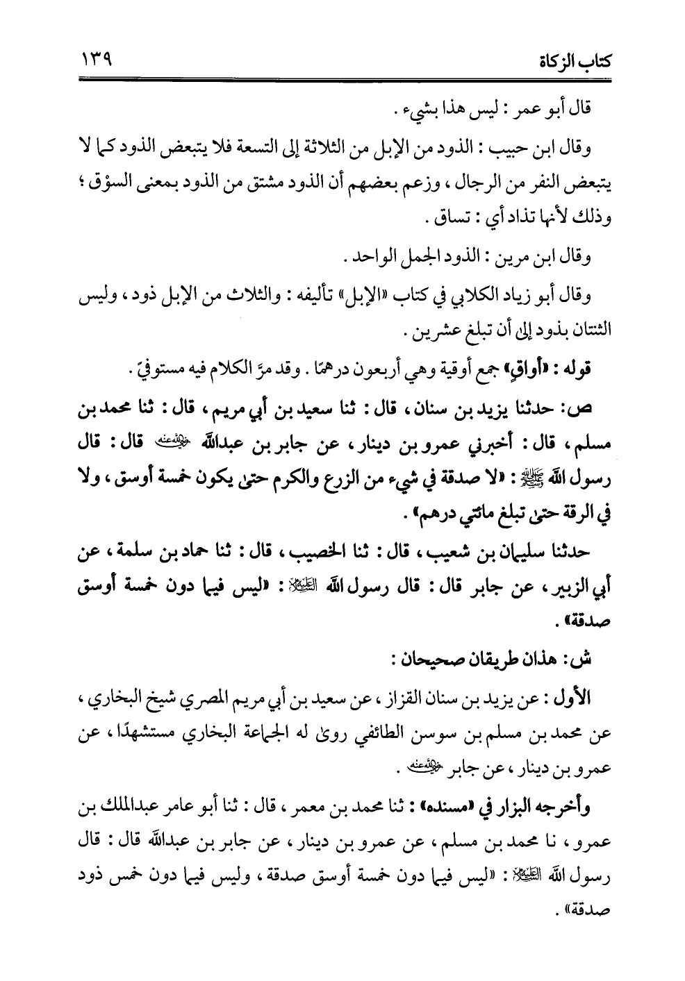 حدثنا سليمان بن شعيب، قال: ثنا الخصيب، قال: ثنا حماد بن سلمة، عن أبي الزبير، عن جابر قال: قال رسول الله - عليه السلام -: "ليس فيما دون خمسة أوسق صدقة".