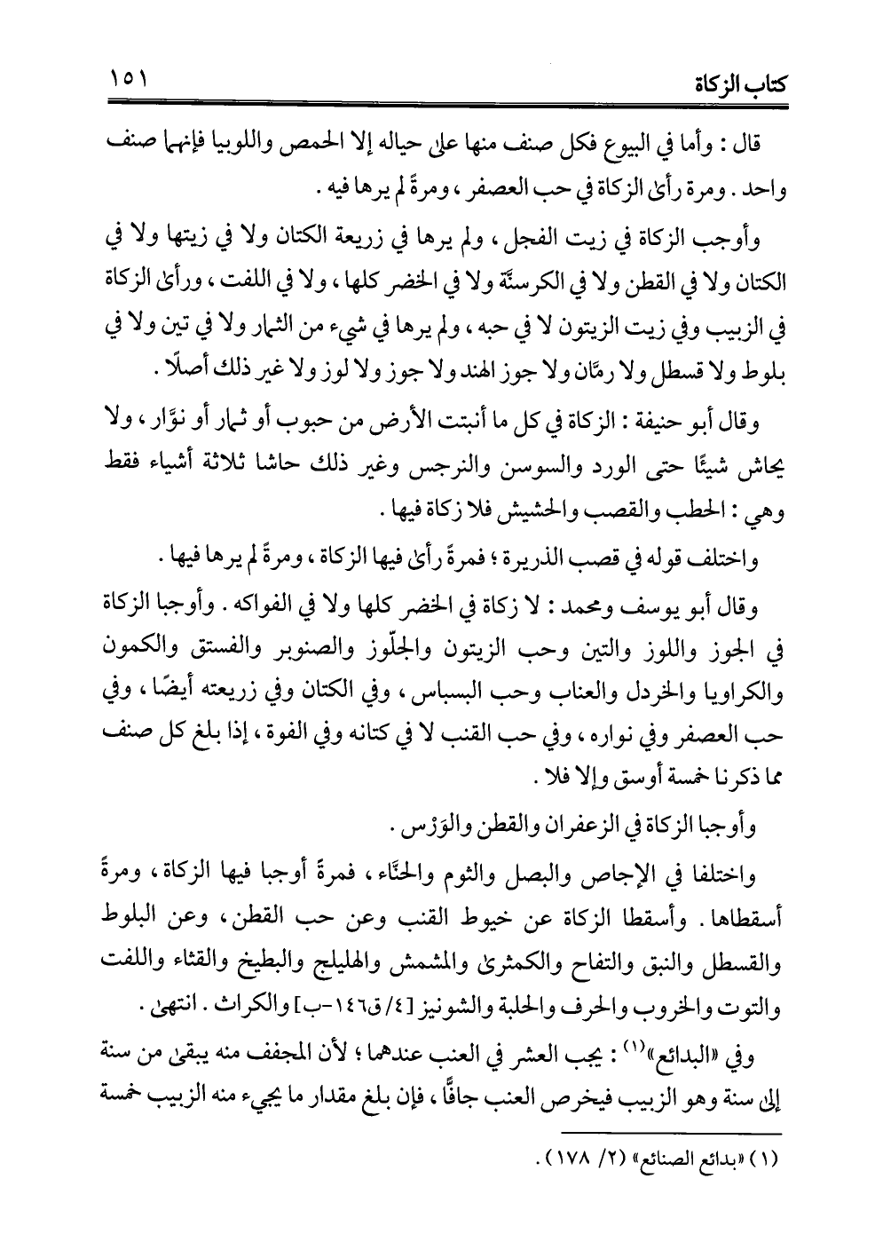 واختلفا في الإجاص والبصل والثوم والحنَّاء، فمرة أوجبا فيها الزكاة، ومرةً أسقطاها. وأسقطا الزكاة عن خيوط القنب وعن حب القطن، وعن البلوط والقسطل والنبق والتفاح والكمثرى والمشمش والهليلج والبطيخ والقثاء واللفت والتوت والخروب والحرف والحلبة والشونيز والكراث. انتهى.