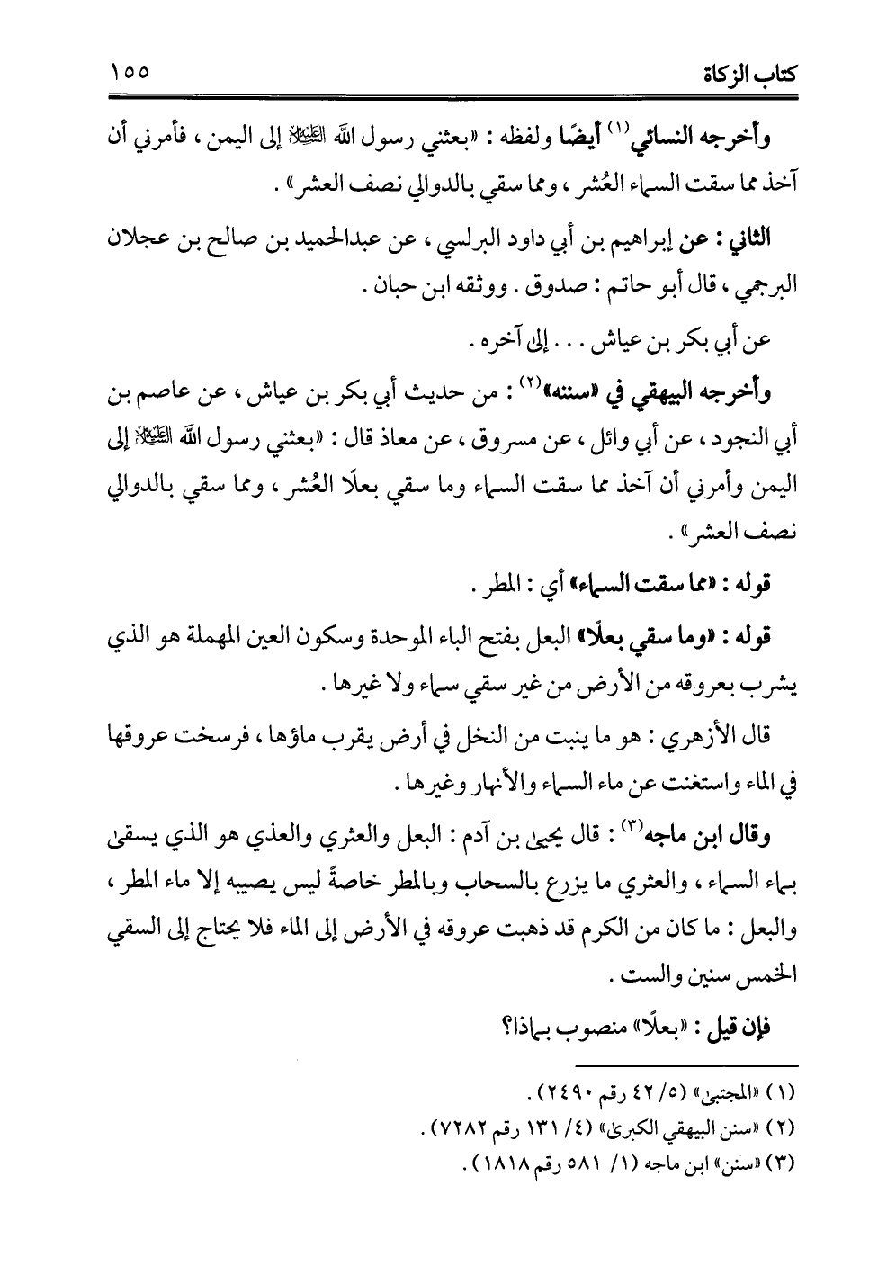 وقال ابن ماجه (¬3): قال يحيى بن آدم: البعل والعثري والعذي هو الذي يسقى بماء السماء، والعثري ما يزرع بالسحاب وبالمطر خاصةً ليس يصيبه إلا ماء المطر، والبعل: ما كان من الكرم قد ذهبت عروقه في الأرض إلى الماء فلا يحتاج إلى السقي الخمس سنين والست.