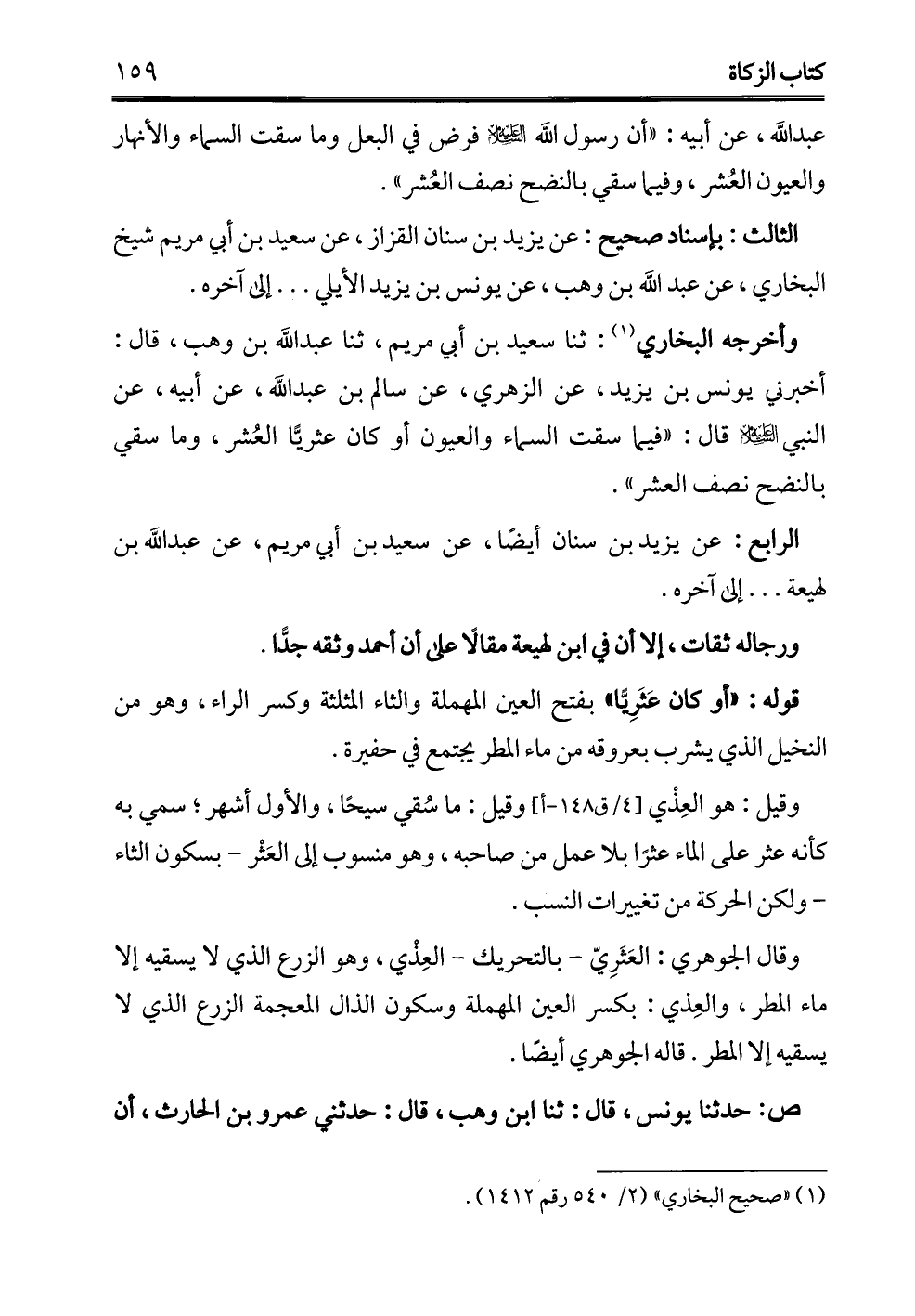 وأخرجه البخاري (¬1): ثنا سعيد بن أبي مريم، ثنا عبد الله بن وهب، قال: أخبرني يونس بن يزيد، عن الزهري، عن سالم بن عبد الله، عن أبيه، عن النبي - عليه السلام - قال: "فيما سقت السماء والعيون أو كان عثريًّا العُشر، وما سقي بالنضح نصف العشر".