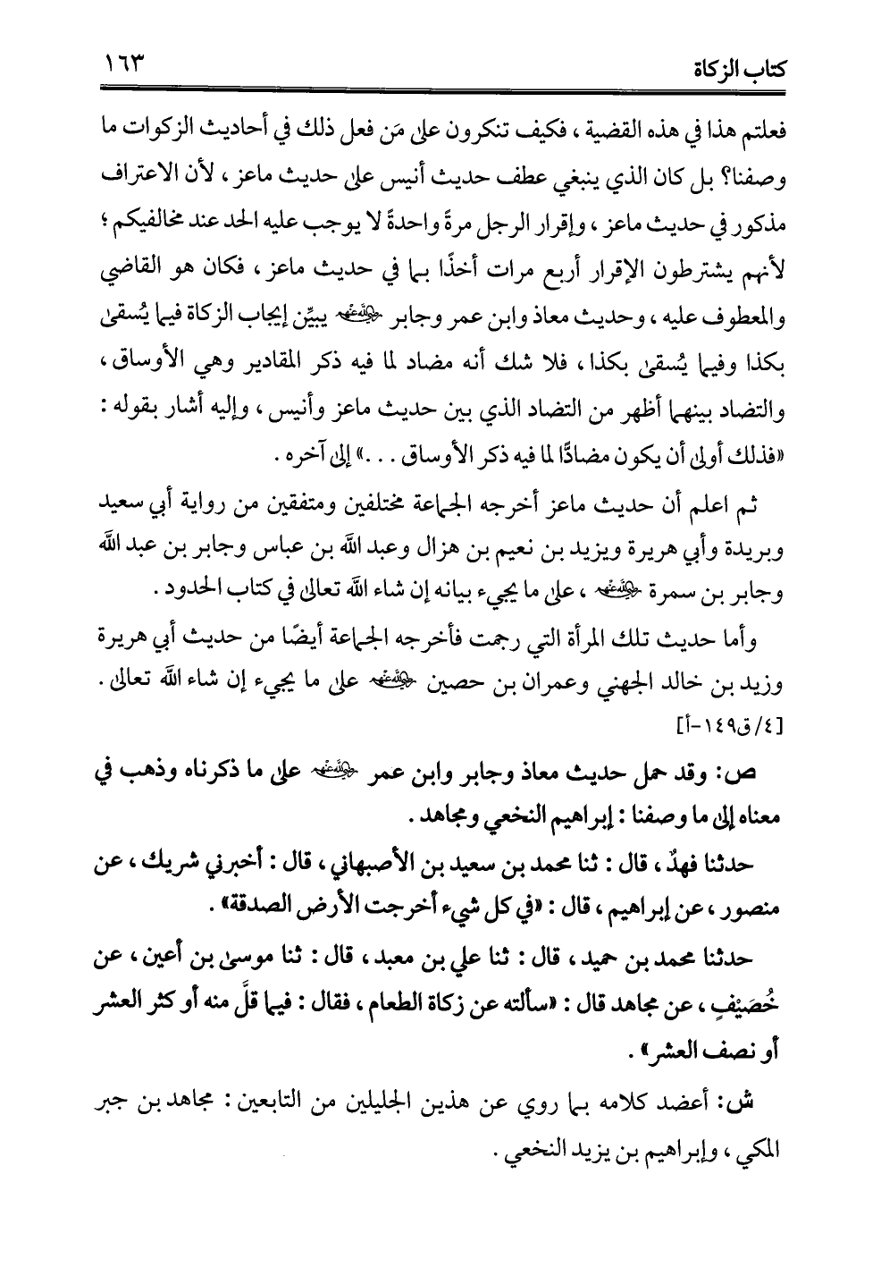 ص: وقد حمل حديث معاذ وجابر وابن عمر - رضي الله عنهم - على ما ذكرناه وذهب في معناه إلى ما وصفنا: إبراهيم النخعي ومجاهد.