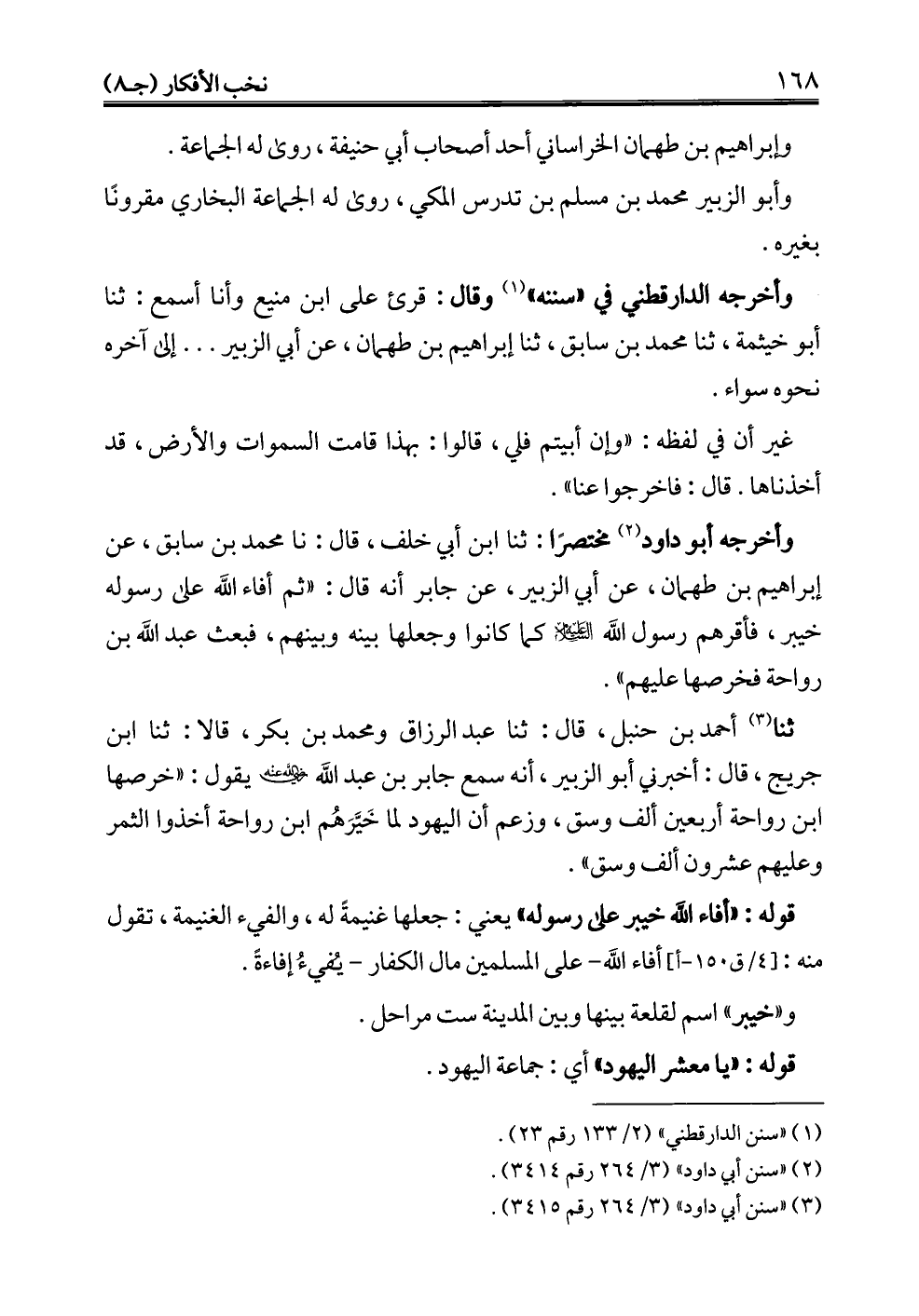 وأخرجه أبو داود (¬2) مختصرًا: ثنا ابن أبي خلف، قال: نا محمَّد بن سابق، عن إبراهيم بن طهمان، عن أبي الزبير، عن جابر أنه قال: "ثم أفاء الله على رسوله خيبر، فأقرهم رسول الله - عليه السلام - كما كانوا وجعلها بينه وبينهم، فبعث عبد الله بن رواحة فخرصها عليهم".