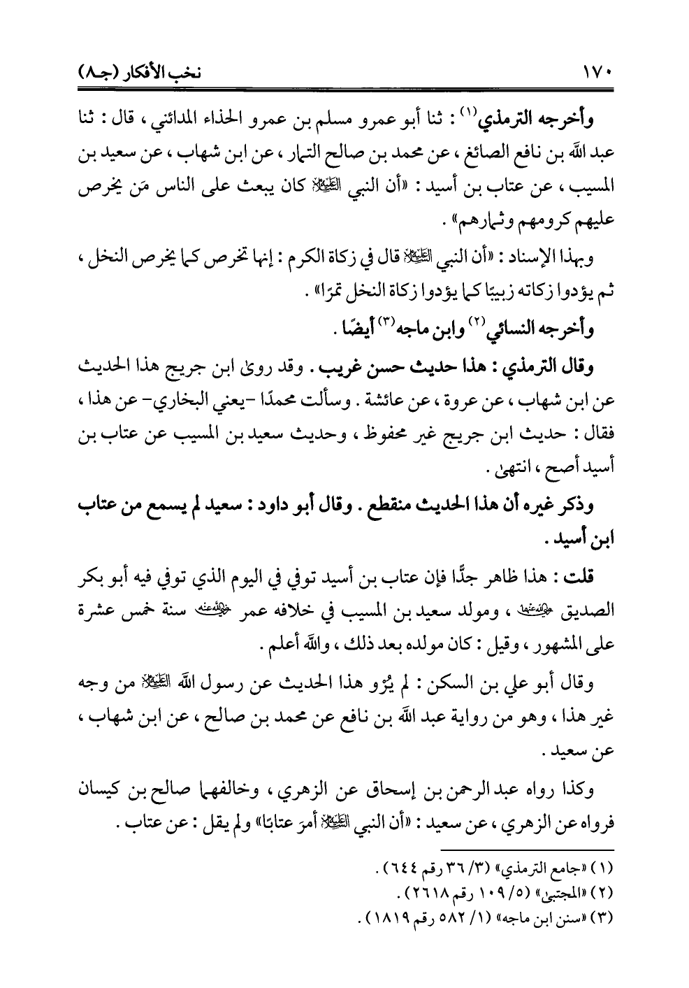 وأخرجه الترمذي (¬1): ثنا أبو عمرو مسلم بن عمرو الحذاء المدائني، قال: ثنا عبد الله بن نافع الصائغ، عن محمَّد بن صالح التمار، عن ابن شهاب، عن سعيد بن المسيب، عن عتاب بن أسيد: "أن النبي - عليه السلام - كان يبعث على الناس مَن يخرص