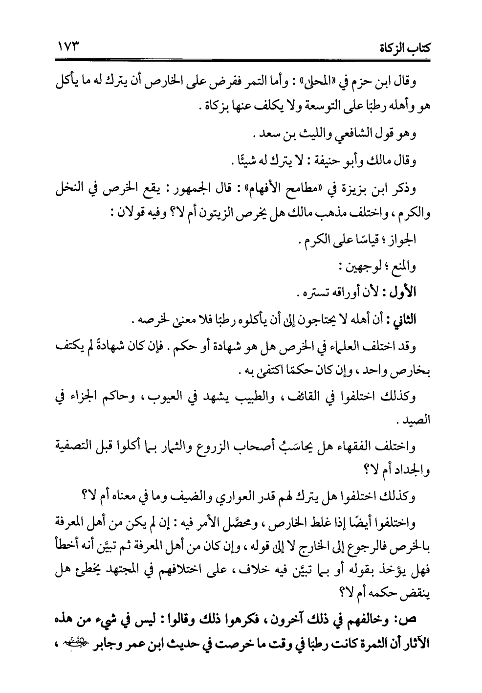وقال ابن حزم في "المحلى": وأما التمر ففرض على الخارص أن يترك له ما يأكل هو وأهله رطبًا على التوسعة ولا يكلف عنها بزكاة.