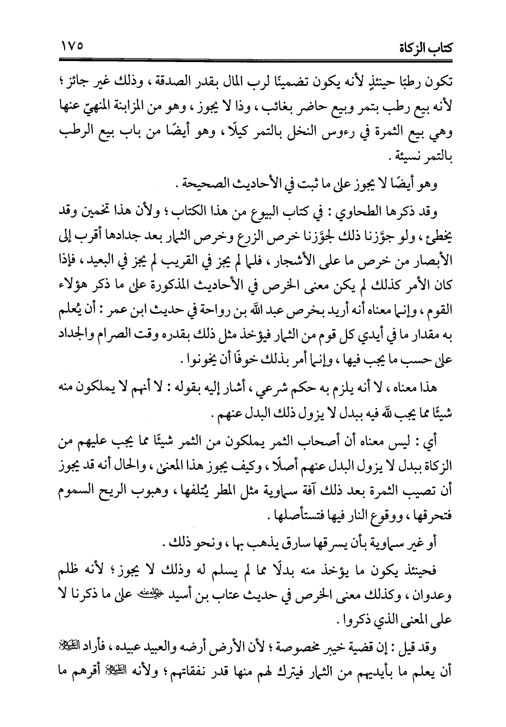 وقد ذكرها الطحاوي: في كتاب البيوع من هذا الكتاب؛ ولأن هذا تخمين وقد يخطئ، ولو جوَّزنا ذلك لجوَّزنا خرص الزرع وخرص الثمار بعد جدادها أقرب إلى الأبصار من خرص ما على الأشجار، فلما لم يجز في القريب لم يجز في البعيد، فإذا كان الأمر كذلك لم يكن معنى الخرص في الأحاديث المذكورة على ما ذكر هؤلاء القوم، وإنما معناه أنه أريد بخرص عبد الله بن رواحة في حديث ابن عمر: أن يُعلم به مقدار ما في أيدي كل قوم من الثمار فيؤخذ مثل ذلك بقدره وقت الصرام والجداد على حسب ما يجب فيها، وإنما أمر بذلك خوفًا أن يخونوا.