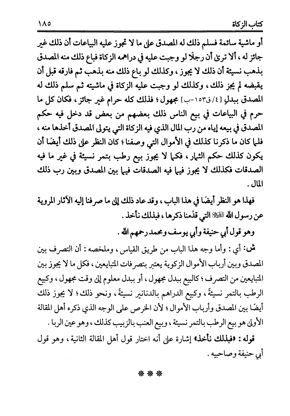 أو ماشية سائمة فسلم ذلك له المصدق على ما لا تجوز عليه البياعات أن ذلك غير جائز له، ألا ترى أن رجلًا لو وجبت عليه في دراهمه الزكاة فباع ذلك منه المصدق بذهب نسيئة أن ذلك لا يجوز، وكذلك لو باع ذلك منه بذهب ثم فارقه قبل أن يقبضه لم يجز ذلك، وكذلك لو وجبت عليه الزكاة في ماشيته ثم سلم ذلك له المصدق ببدلٍ مجهول؛ فذلك كله حرام غير جائز، فكان كل ما حرم في البياعات في بيع الناس ذلك بعضهم من بعض قد دخل فيه حكم المصدق في بيعه إياه من رب المال الذي فيه الزكاة التي يتولى المصدق أخذها منه، فلما كان ما ذكرنا كذلك في الأموال التي وصفنا؛ كان النظر على ذلك أيضًا أن يكون كذلك حكم الثمار، فكما لا يجوز بيع رطب بتمر نسيئة في غير ما فيه الصدقات فكذلك لا يجوز فيما فيه الصدقات فيما بين المصدق وبين رب ذلك المال.