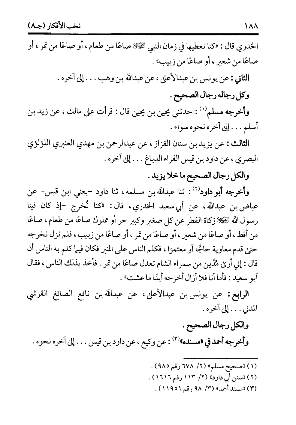 الخدري قال: "كنا نعطيها في زمان النبي - عليه السلام - صاعًا من طعام، أو صاعًا من تمر، أو صاعًا من شعير، أو صاعًا من زبيب".