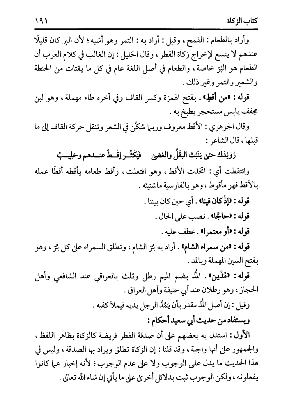 وأراد بالطعام: القمح، وقيل: أراد به: التمر وهو أشبه؛ لأن البر كان قليلًا عندهم لا يتسع لإخراج زكاة الفطر، وقال الخليل: إن الغالب في كلام العرب أن الطعام هو البُرّ خاصة، والطعام في أصل اللغة عام في كل ما يقتات من الحنطة والشعير والتمر وغير ذلك.