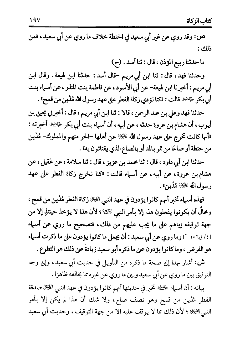 بيانه: أن أسماء - رضي الله عنها - تخبر في حديثها أنهم كانوا يؤدون في عهد النبي - عليه السلام - صدقة الفطر مُدَّين من قمح وهو نصف صاع، ولا شك أن هذا لم يكن إلا بأمر النبي - عليه السلام -؛ لأن ذلك مما لا يوقف عليه إلا من جهة التوقيف، وحديث أبي سعيد