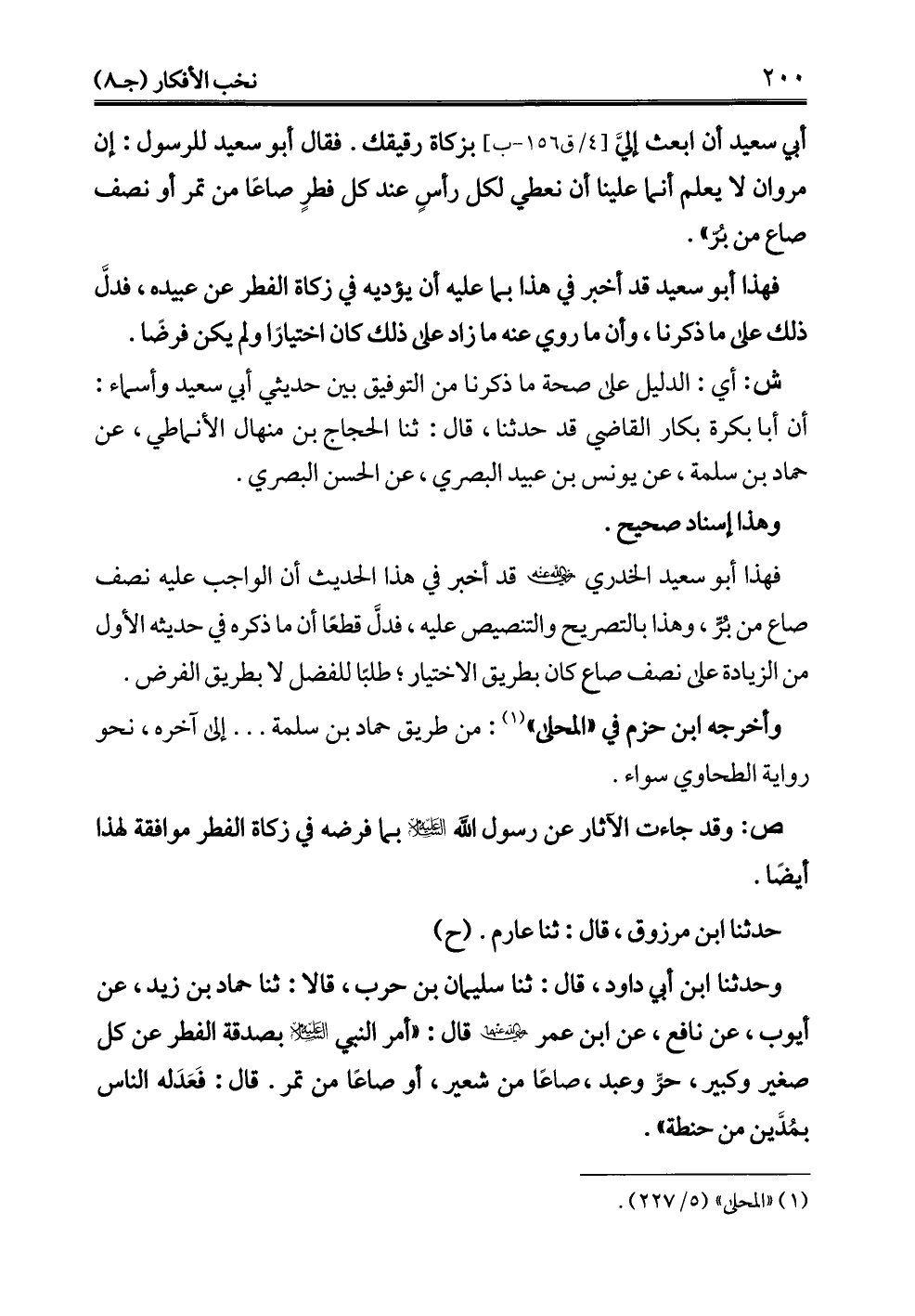 وأخرجه ابن حزم في "المحلى" (¬1): من طريق حماد بن سلمة ... إلى آخره، نحو رواية الطحاوي سواء.