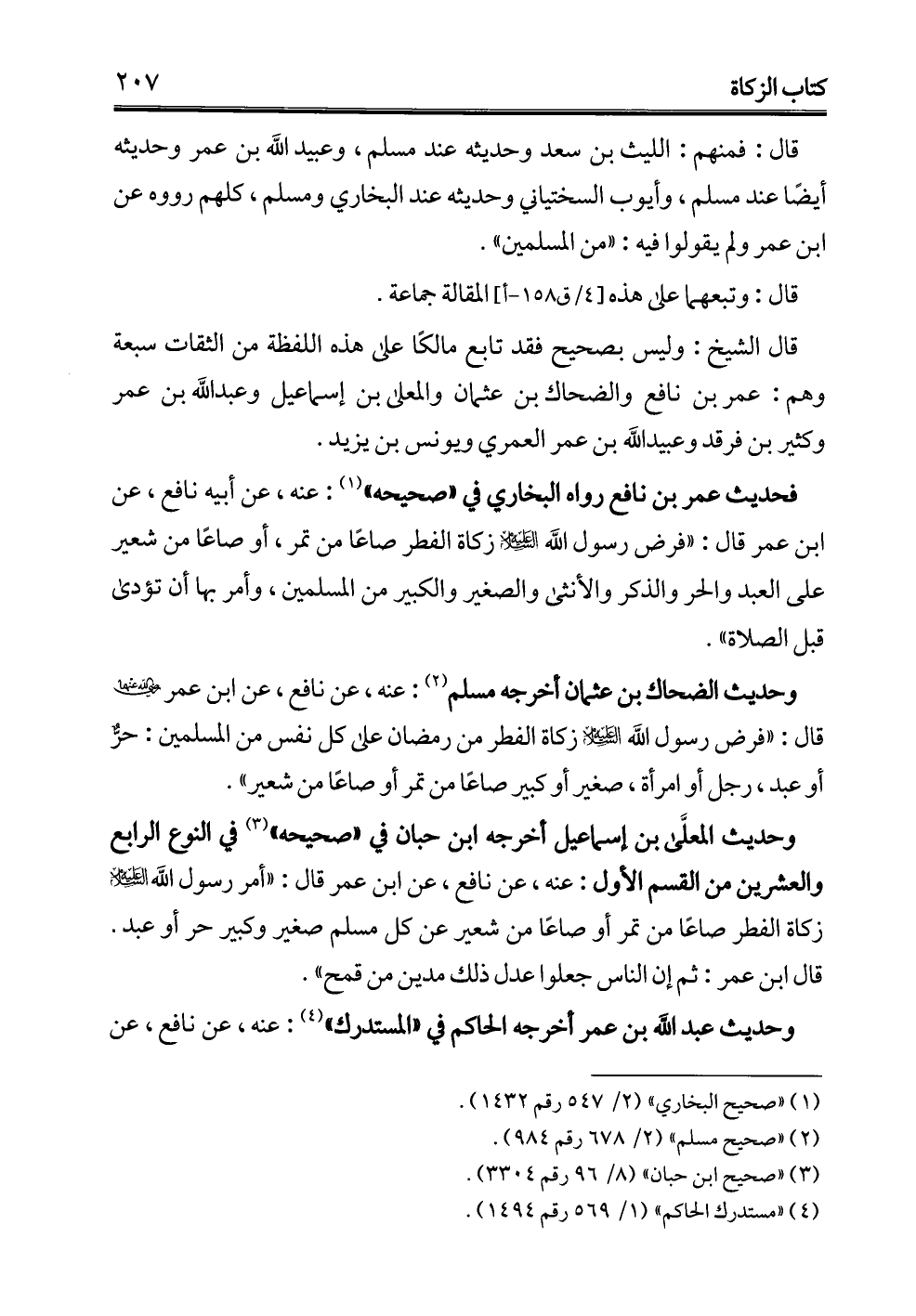 قال: فمنهم: الليث بن سعد وحديثه عند مسلم، وعبيد الله بن عمر وحديثه أيضًا عند مسلم، وأيوب السختياني وحديثه عند البخاري ومسلم، كلهم رووه عن ابن عمر ولم يقولوا فيه: "من المسلمين".