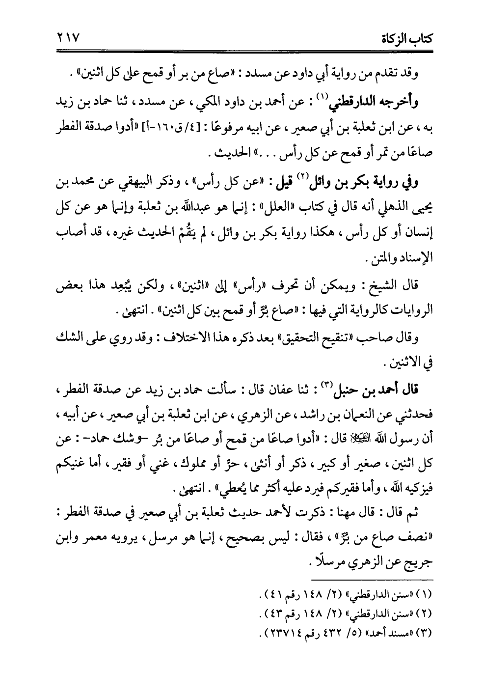 ثم قال: قال مهنا: ذكرت لأحمد حديث ثعلبة بن أبي صعير في صدقة الفطر: "نصف صاع من بُرٍّ"، فقال: ليس بصحيح، إنما هو مرسل، يرويه معمر وابن جريج عن الزهري مرسلًا.