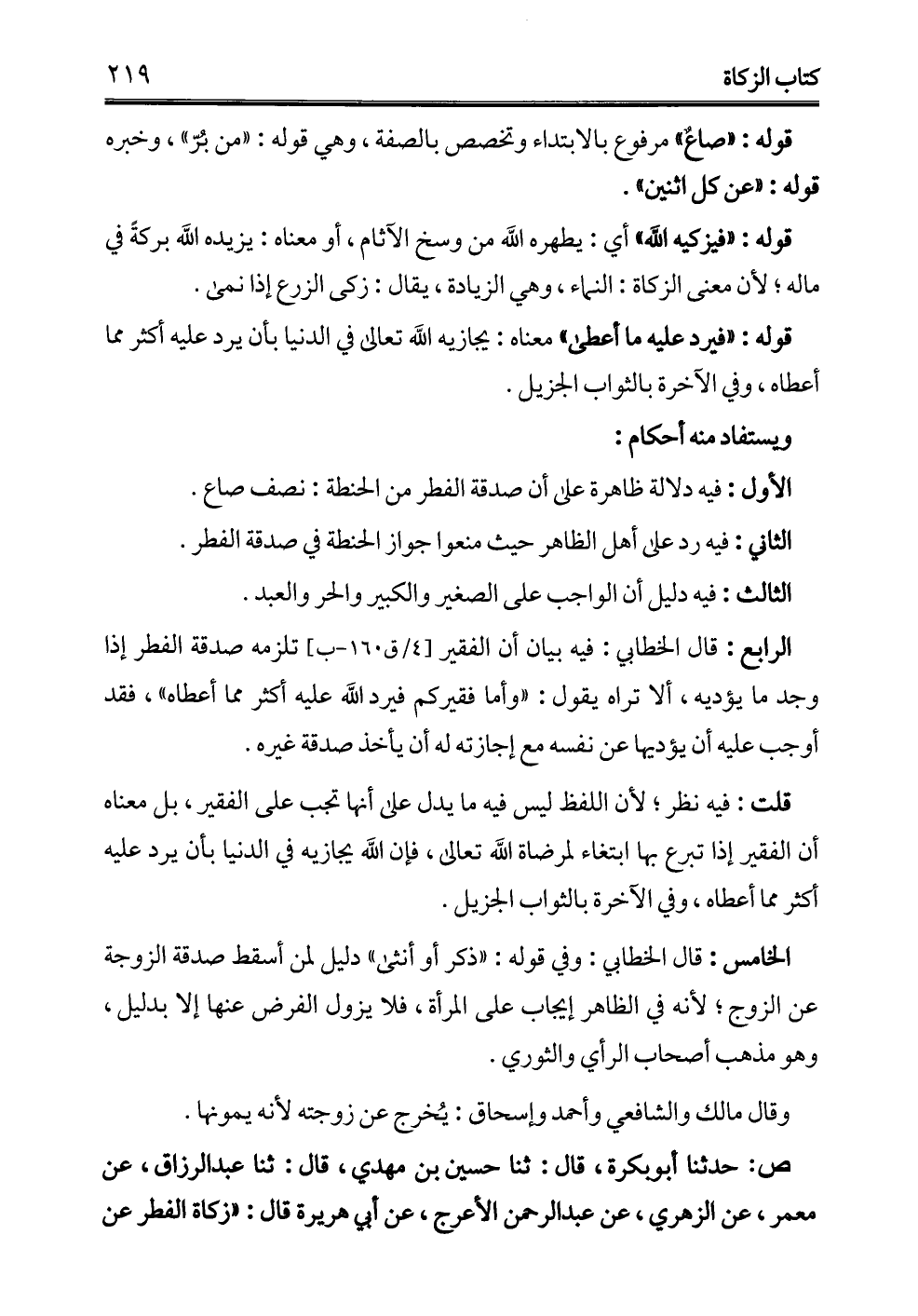 الخامس: قال الخطابي: وفي قوله: "ذكر أو أنثى" دليل لمن أسقط صدقة الزوجة عن الزوج؛ لأنه في الظاهر إيجاب على المرأة، فلا يزول الفرض عنها إلا بدليل، وهو مذهب أصحاب الرأي والثوري.