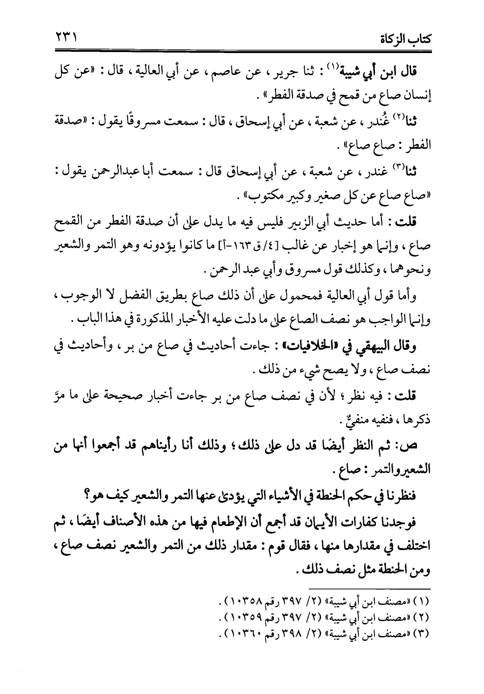 قلت: أما حديث أبي الزبير فليس فيه ما يدل على أن صدقة الفطر من القمح صاع، وإنما هو إخبار عن غالب ما كانوا يؤدونه وهو التمر والشعير ونحوهما، وكذلك قول مسروق وأبي عبد الرحمن.