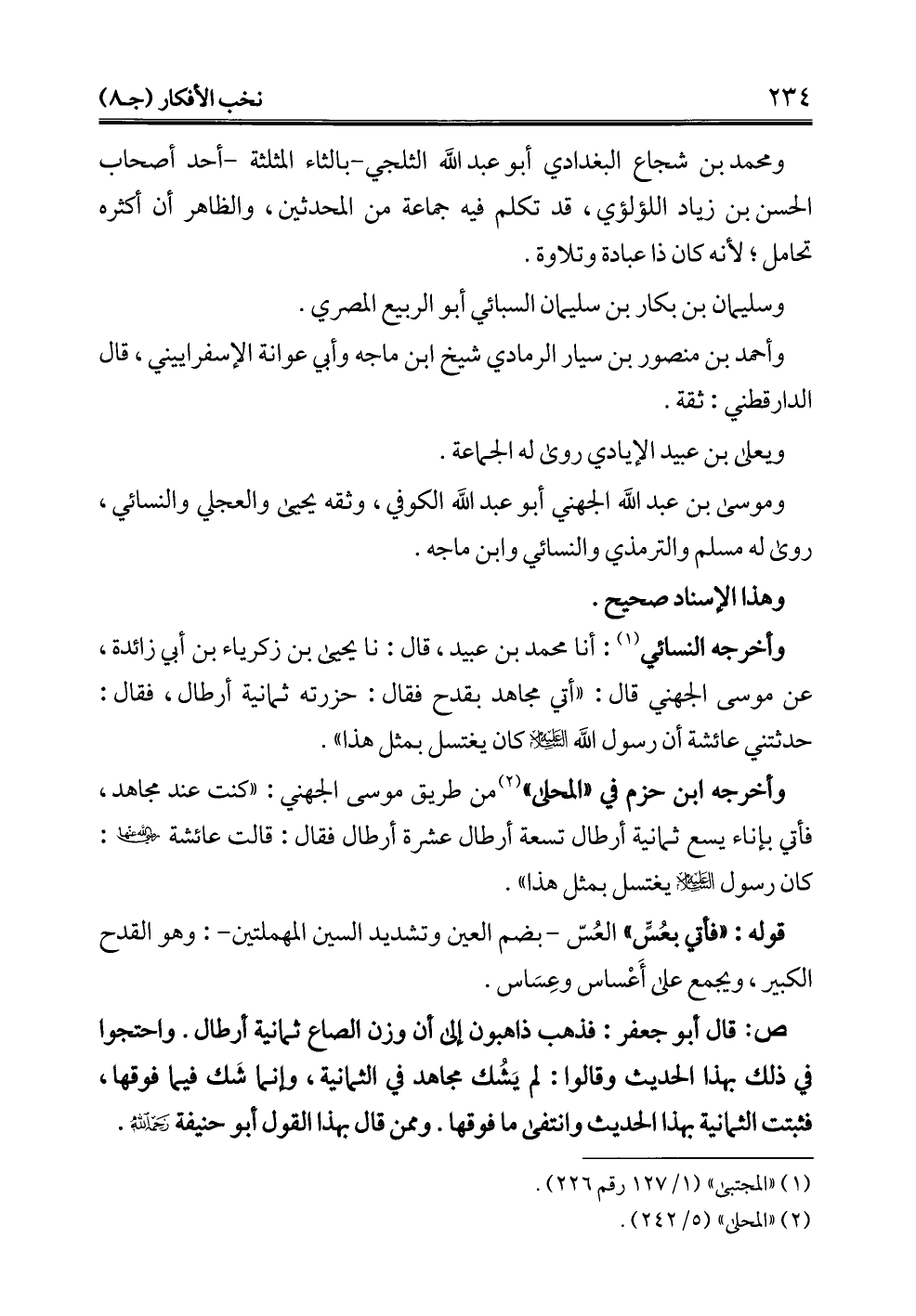 وأخرجه ابن حزم في "المحلى" (¬2) من طريق موسى الجهني: "كنت عند مجاهد، فأتي بإناء يسع ثمانية أرطال تسعة أرطال عشرة أرطال فقال: قالت عائشة - رضي الله عنها -: كان رسول - عليه السلام - يغتسل بمثل هذا".