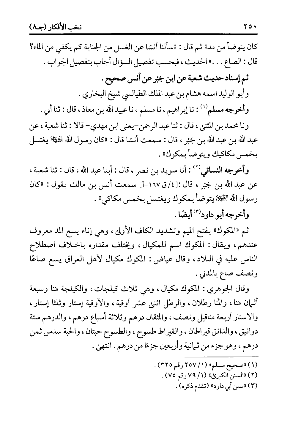 وأخرجه النسائي (¬2): أنا سويد بن نصر، قال: أبنا عبد الله، قال: ثنا شعبة، عن عبد الله بن جَبْر، قال: سمعت أنس بن مالك يقول: "كان رسول الله - عليه السلام - يتوضأ بمكوك ويغتسل بخمس مكاكي".