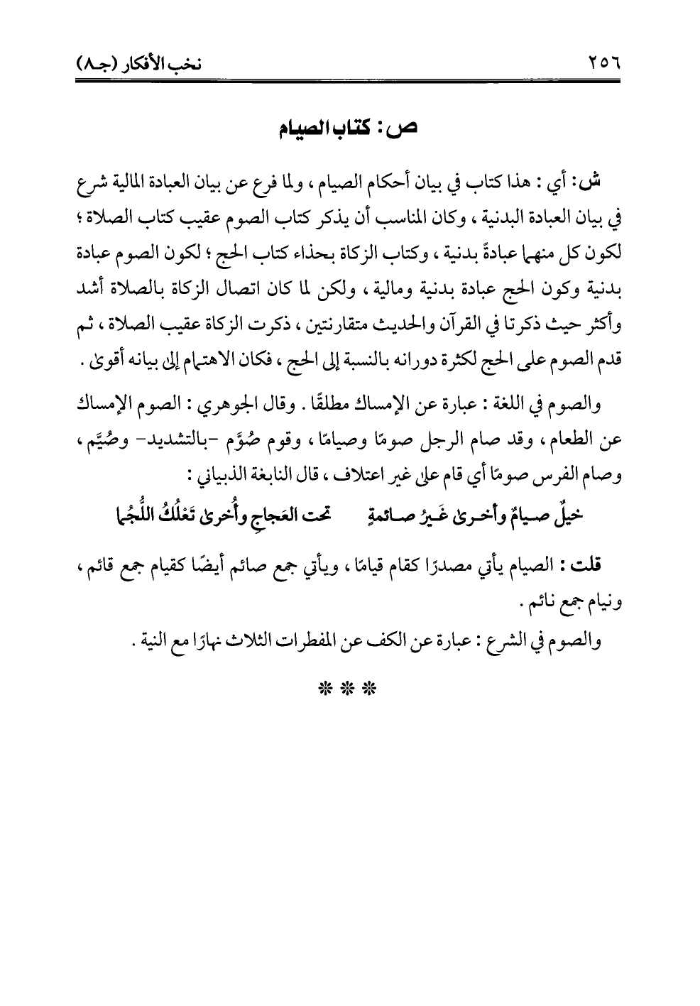 والصوم في اللغة: عبارة عن الإمساك مطلقًا. وقال الجوهري: الصوم الإمساك عن الطعام، وقد صام الرجل صومًا وصيامًا، وقوم صُوَّم -بالتشديد- وصُيَّم، وصام الفرس صومًا أي قام على غير اعتلاف، قال النابغة الذبياني: