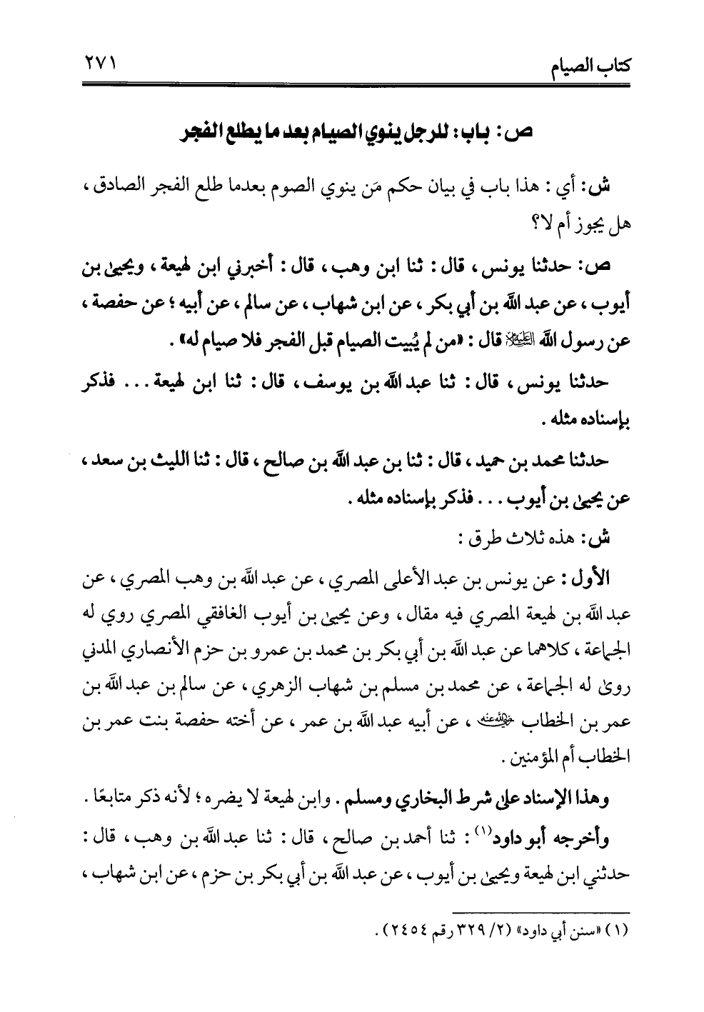 ص: حدثنا يونس، قال: ثنا ابن وهب، قال: أخبرني ابن لهيعة، ويحيى بن أيوب، عن عبد الله بن أبي بكر، عن ابن شهاب، عن سالم، عن أبيه؛ عن حفصة، عن رسول الله - عليه السلام - قال: "من لم يُبيت الصيام قبل الفجر فلا صيام له".