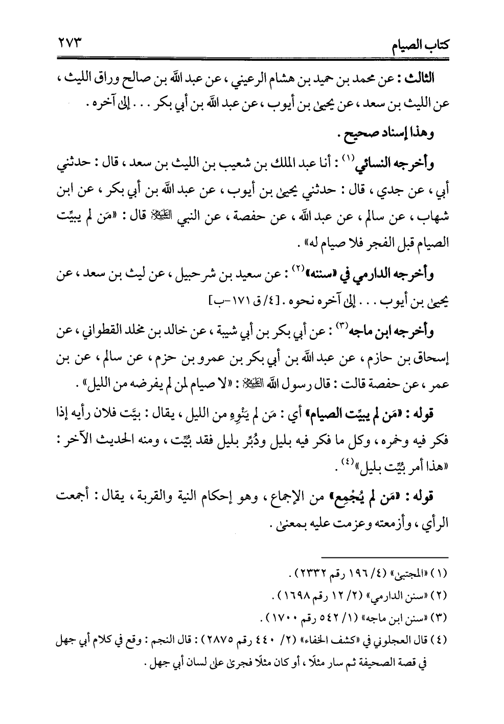 وأخرجه النسائي (¬1): أنا عبد الملك بن شعيب بن الليث بن سعد، قال: حدثني أبي، عن جدي، قال: حدثني يحيى بن أيوب، عن عبد الله بن أبي بكر، عن ابن شهاب، عن سالم، عن عبد الله، عن حفصة، عن النبي - عليه السلام - قال: "مَن لم يبيِّت الصيام قبل الفجر فلا صيام له".