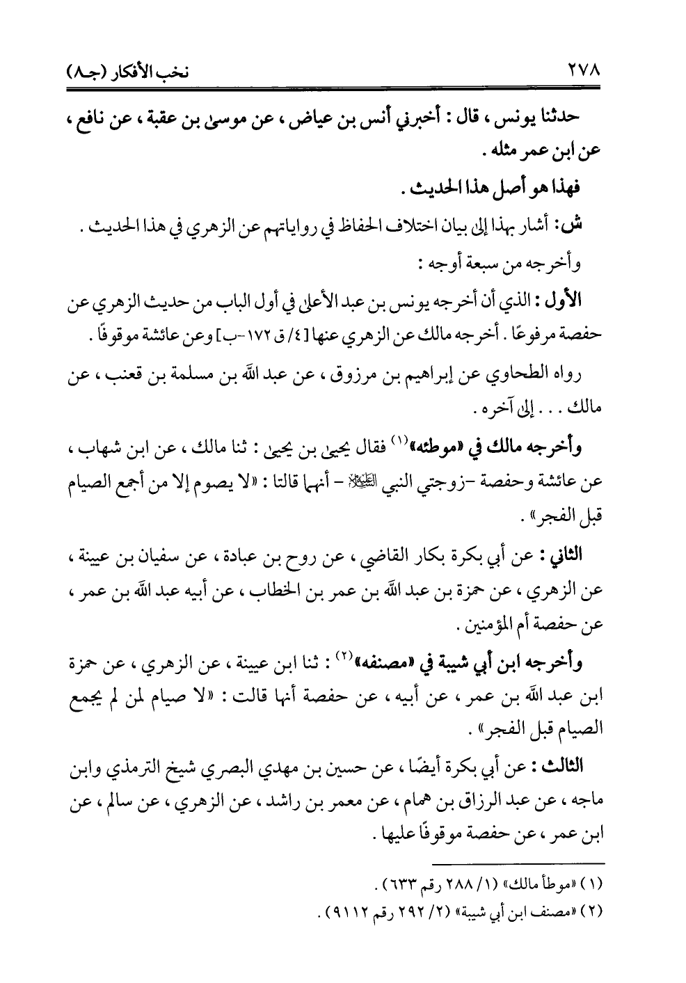 الأول: الذي أخرجه يونس بن عبد الأعلى في أول الباب من حديث الزهري عن حفصة مرفوعًا. أخرجه مالك عن الزهري عنها وعن عائشة موقوفًا.