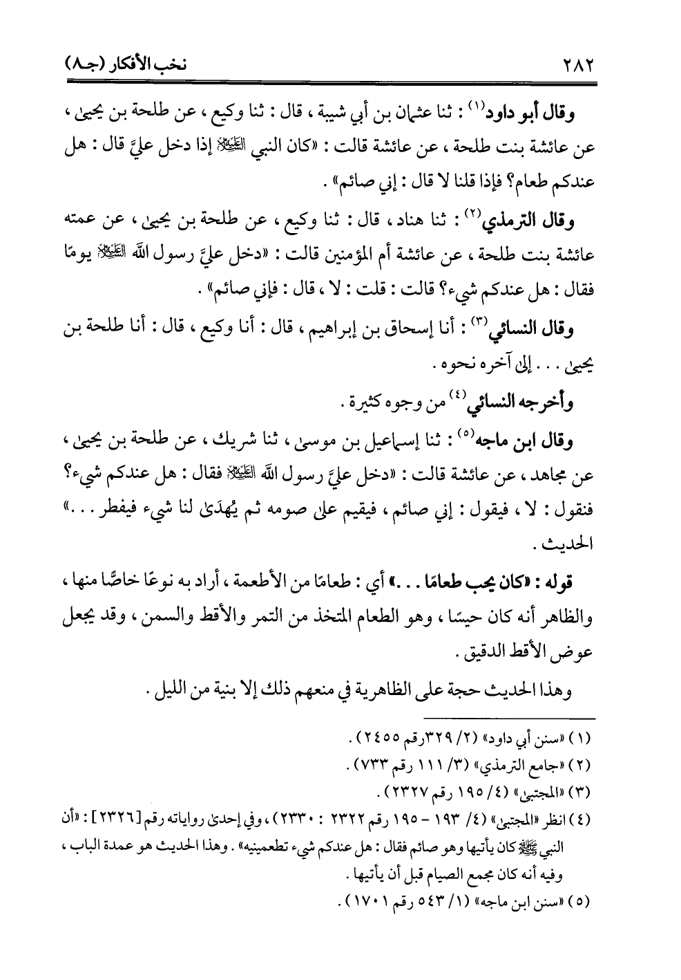 (¬4) انظر "المجتبى" (4/ 193 - 195 رقم 2322: 2330)، وفي إحدى رواياته رقم [2326]: "أن النبي - صلى الله عليه وسلم - كان يأتيها وهو صائم فقال: هل عندكم شيء تطعمينيه". وهذا الحديث هو عمدة الباب، وفيه أنه كان مجمع الصيام قبل أن يأتيها.