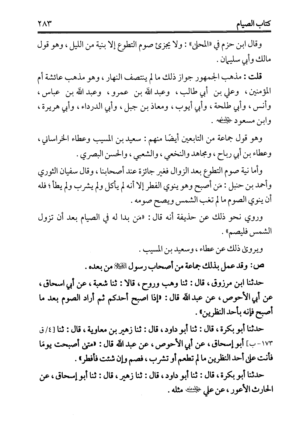 وأما نية صوم التطوع بعد الزوال فغير جائزة عند أصحابنا، وقال سفيان الثوري وأحمد بن حنبل: مَن أصبح وهو ينوي الفطر إلا أنه لم يأكل ولم يشرب ولم يطأ؛ فله أن ينوي الصوم ما لم تغلب الشمس ويصح صومه.