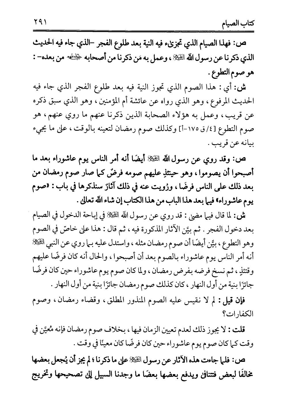ش: أي: هذا الصوم الذي تجوز النية فيه بعد طلوع الفجر الذي جاء فيه الحديث المرفوع، وهو الذي رواه عن عائشة أم المؤمنين، وهو الذي سبق ذكره عن قريب، وعمل به هؤلاء الصحابة الذين ذكرنا عنهم ما روي عنهم، هو صوم التطوع وكذلك صوم رمضان لتعينه بالوقت، على ما يجيء بيانه عن قريب.