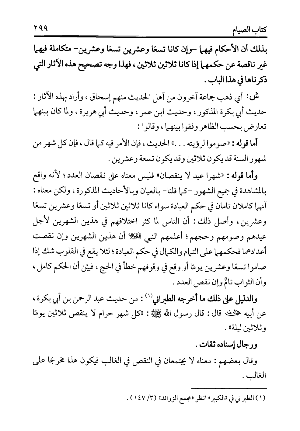 بذلك أن الأحكام فيهما -وإن كانا تسعًا وعشرين تسعًا وعشرين- متكاملة فيهما غير ناقصة عن حكمهما إذا كانا ثلاثين ثلاثين، فهذا وجه تصحيح هذه الآثار التي ذكرناها في هذا الباب.