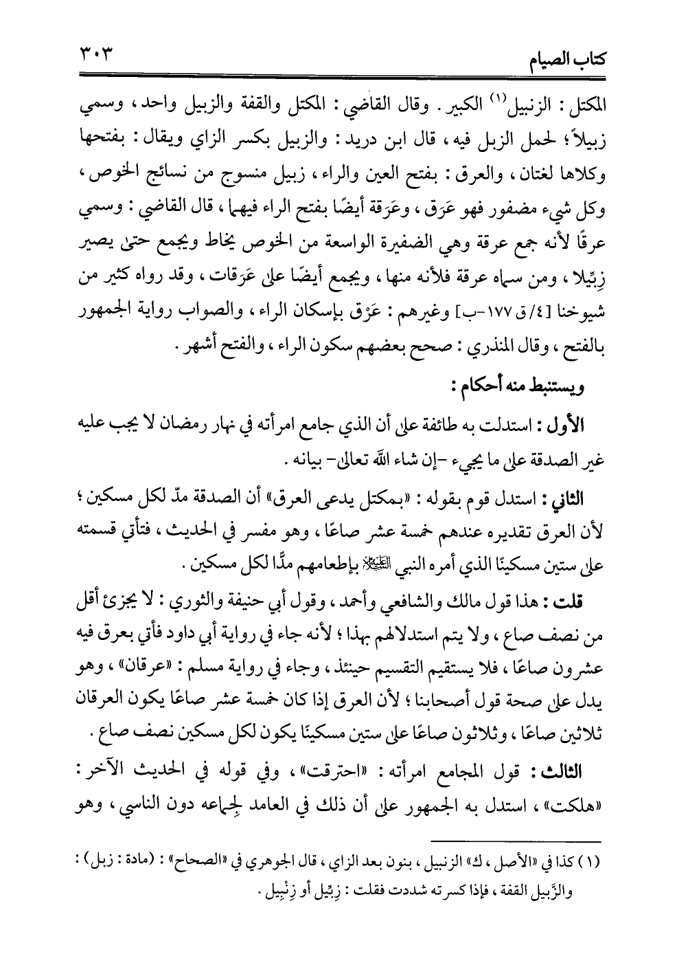 المكتل: الزنبيل (¬1) الكبير. وقال القاضي: المكتل والقفة والزبيل واحد، وسمي زبيلًا؛ لحمل الزبل فيه، قال ابن دريد: والزبيل بكسر الزاي ويقال: بفتحها وكلاها لغتان، والعرق: بفتح العين والراء، زبيل منسوج من نسائج الخوص، وكل شيء مضفور فهو عَرَق، وعَرَقة أيضًا بفتح الراء فيهما، قال القاضي: وسمي عرقًا لأنه جمع عرقة وهي الضفيرة الواسعة من الخوص يخاط ويجمع حتى يصير زِبِّيلا، ومن سماه عرقة فلأنه منها، ويجمع أيضًا على عَرَقات، وقد رواه كثير من شيوخنا وغيرهم: عَرْق بإسكان الراء، والصواب رواية الجمهور بالفتح، وقال المنذري: صحح بعضهم سكون الراء، والفتح أشهر.