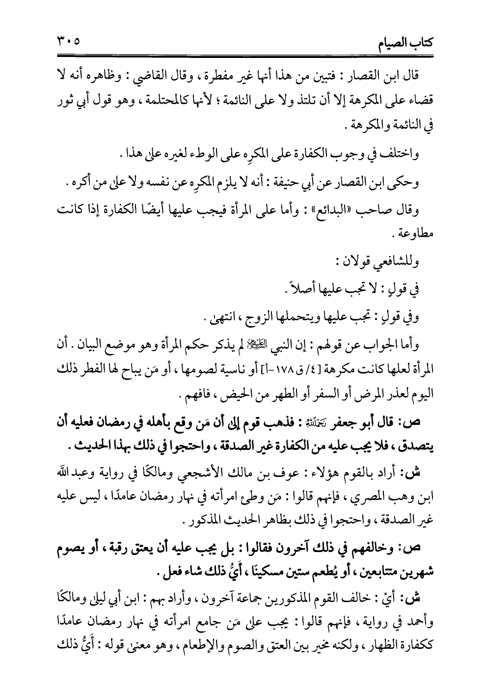 ش: أراد بالقوم هؤلاء: عوف بن مالك الأشجعي ومالكًا في رواية وعبد الله ابن وهب المصري، فإنهم قالوا: مَن وطئ امرأته في نهار رمضان عامدًا، ليس عليه غير الصدقة، واحتجوا في ذلك بظاهر الحديث المذكور.