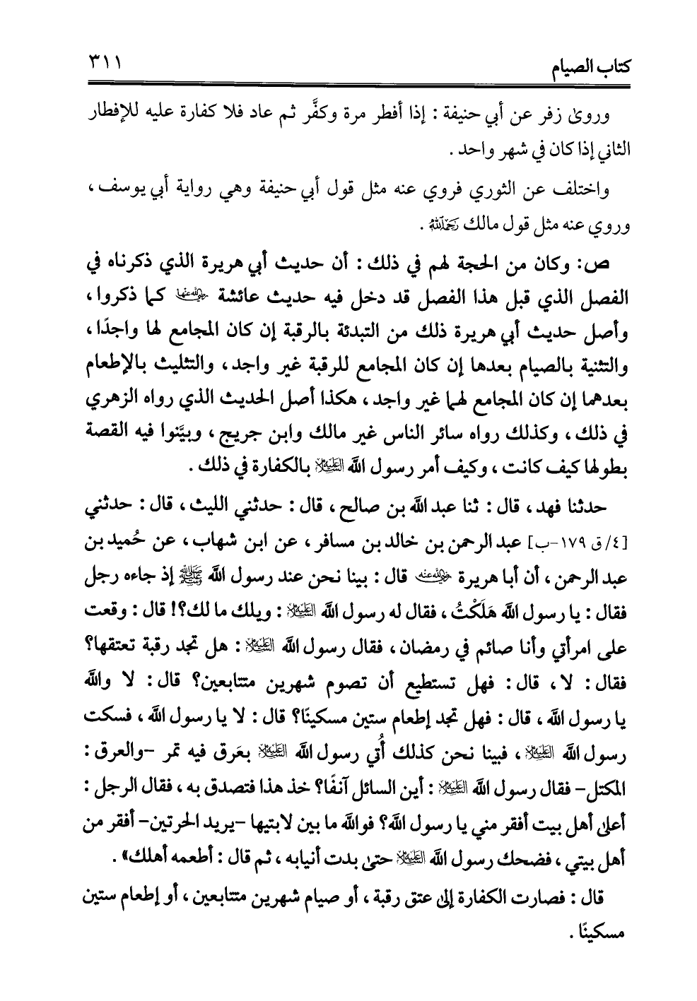 حدثنا فهد، قال: ثنا عبد الله بن صالح، قال: حدثني الليث، قال: حدثني عبد الرحمن بن خالد بن مسافر، عن ابن شهاب، عن حُميد بن عبد الرحمن، أن أبا هريرة - رضي الله عنه - قال: بينا نحن عند رسول الله - صلى الله عليه وسلم - إذ جاءه رجل فقال: يا رسول الله هَلَكْتُ، فقال له رسول الله - عليه السلام -: ويلك ما لك؟! قال: وقعت على امرأتي وأنا صائم في رمضان، فقال رسول الله - عليه السلام -: هل تجد رقبة تعتقها؟ فقال: لا، قال: فهل تستطيع أن تصوم شهرين متتابعين؟ قال: لا والله يا رسول الله، قال: فهل تجد إطعام ستين مسكينًا؟ قال: لا يا رسول الله، فسكت رسول الله - عليه السلام - فبينا نحن كذلك أُتي رسول الله - عليه السلام - بعَرق فيه تمر -والعرق: المكتل- فقال رسول الله - عليه السلام -: أين السائل آنفًا؟ خذ هذا فتصدق به، فقال الرجل: أعلى أهل بيت أفقر مني يا رسول الله؟ فوالله ما بين لابتيها -يريد الحرتين- أفقر من أهل بيتي، فضحك رسول الله - عليه السلام - حتى بدت أنيابه، ثم قال: أطعمه أهلك".
