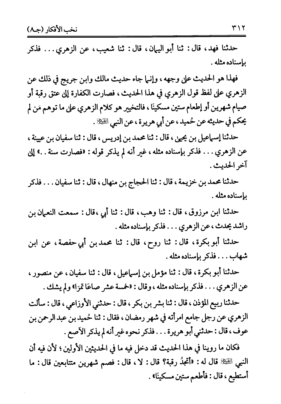 فهذا هو الحديث على وجهه، وإنما جاء حديث مالك وابن جريج في ذلك عن الزهري على لفظ قول الزهري في هذا الحديث، فصارت الكفارة إلى عتق رقبة أو صيام شهرين أو إطعام ستين مسكينًا، فالتخيير هو كلام الزهري على ما توهم مَن لم يحكم في حديثه عن حُميد، عن أبي هريرة، عن النبي - عليه السلام -.