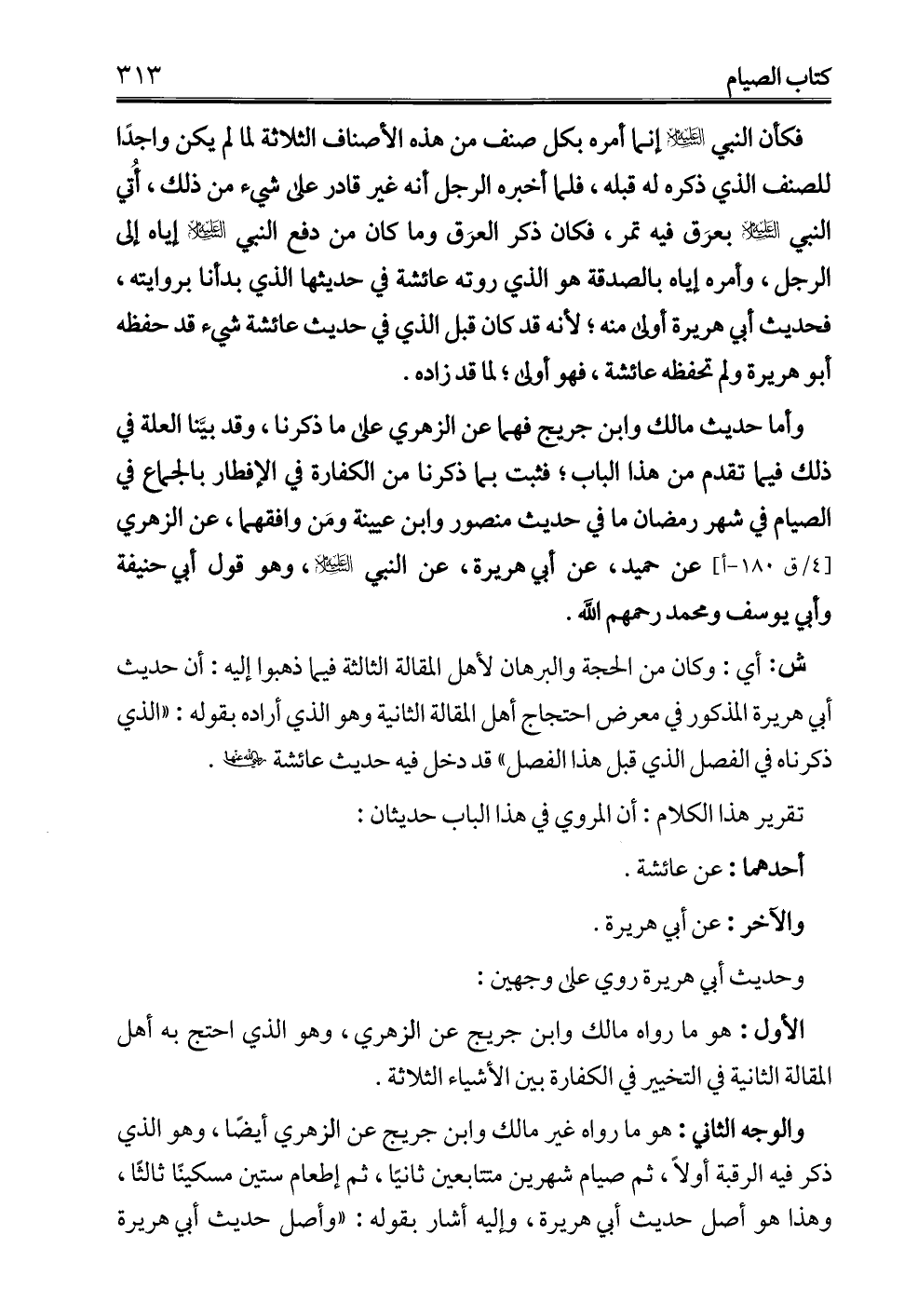 وأما حديث مالك وابن جريج فهما عن الزهري على ما ذكرنا، وقد بيَّنا العلة في ذلك فيما تقدم من هذا الباب؛ فثبت بما ذكرنا من الكفارة في الإفطار بالجماع في الصيام في شهر رمضان ما في حديث منصور وابن عيينة ومَن وافقهما، عن الزهري عن حميد، عن أبي هريرة، عن النبي - عليه السلام -، وهو قول أبي حنيفة وأبي يوسف ومحمد رحمهم الله.