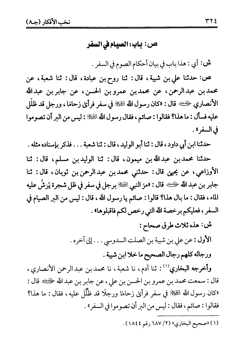 ص: حدثنا علي بن شيبة، قال: ثنا روح بن عبادة، قال: ثنا شعبة، عن محمد بن عبد الرحمن، عن محمد بن عمرو بن الحسن، عن جابر بن عبد الله الأنصاري - رضي الله عنه - قال: "كان رسول الله - عليه السلام - في سفر فرأى زحامًا، ورجل قد ظلِّل عليه فسأل: ما هذا؟ فقالوا: صائم، فقال رسول الله - عليه السلام -: ليس من البر أن تصوموا في السفر".