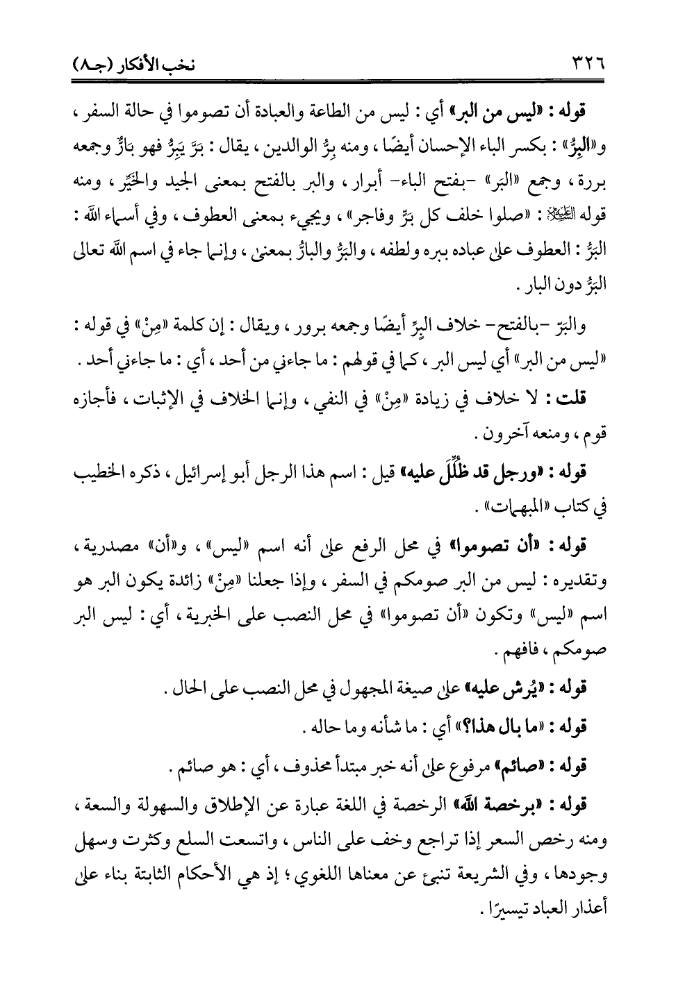 قوله: "ليس من البر" أي: ليس من الطاعة والعبادة أن تصوموا في حالة السفر، و"البِرُّ": بكسر الباء الإحسان أيضًا، ومنه بِرُّ الوالدين، يقال: بَرَّ يَبِرُّ فهو بَارٌّ وجمعه بررة، وجمع "البَر" -بفتح الباء- أبرار، والبر بالفتح بمعنى الجيد والخَيِّر، ومنه قوله - عليه السلام -: "صلوا خلف كل بَرٍّ وفاجر"، ويجيء بمعنى العطوف، وفي أسماء الله: البَرُّ: العطوف على عباده ببره ولطفه، والبَرُّ والبارُّ بمعنى، وإنما جاء في اسم الله تعالى البَرُّ دون البار.
