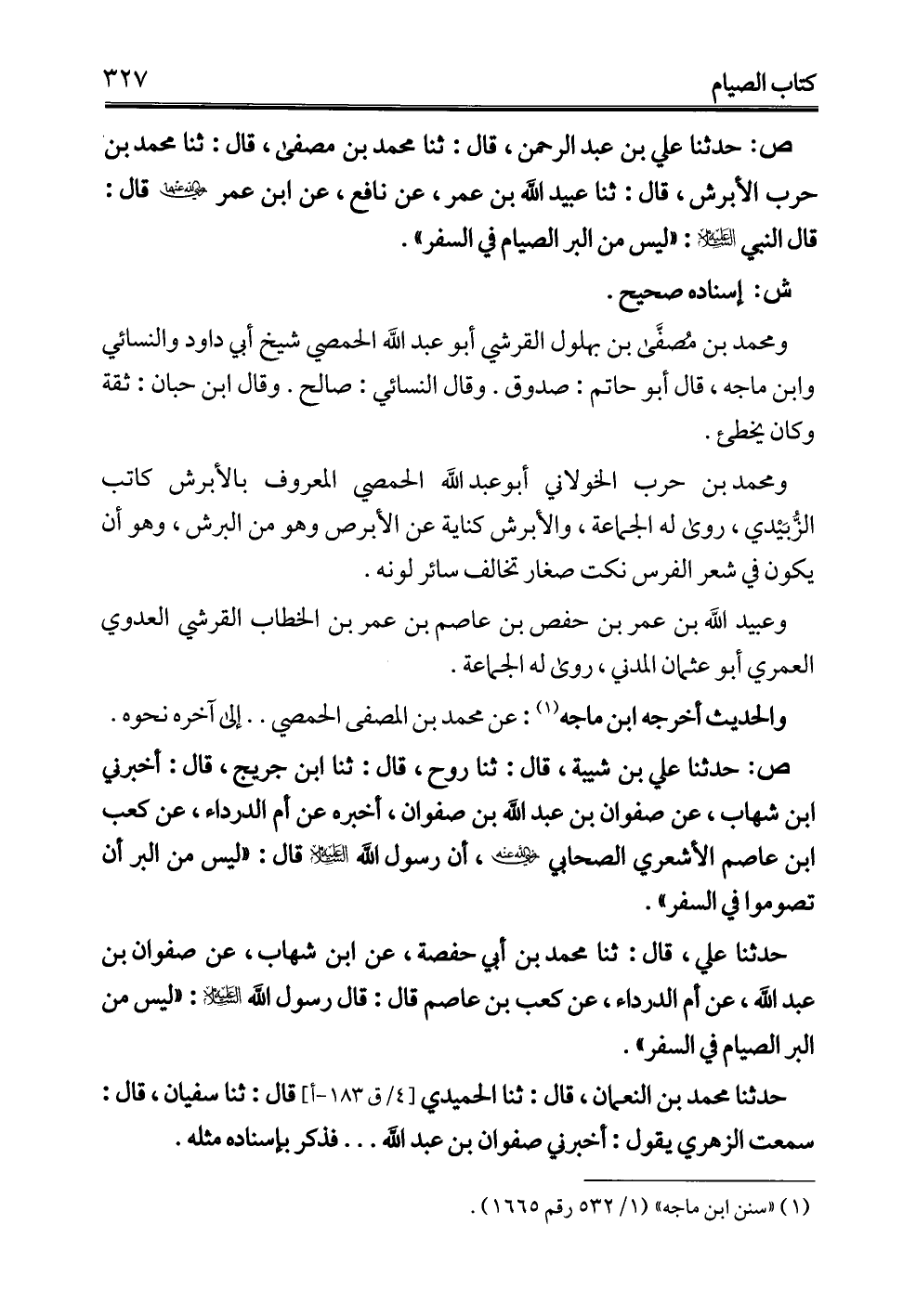 ص: حدثنا علي بن عبد الرحمن، قال: ثنا محمَّد بن مصفى، قال: ثنا محمد بن حرب الأبرش، قال: ثنا عبيد الله بن عمر، عن نافع، عن ابن عمر - رضي الله عنهما - قال: قال النبي - عليه السلام -: "ليس من البر الصيام في السفر".