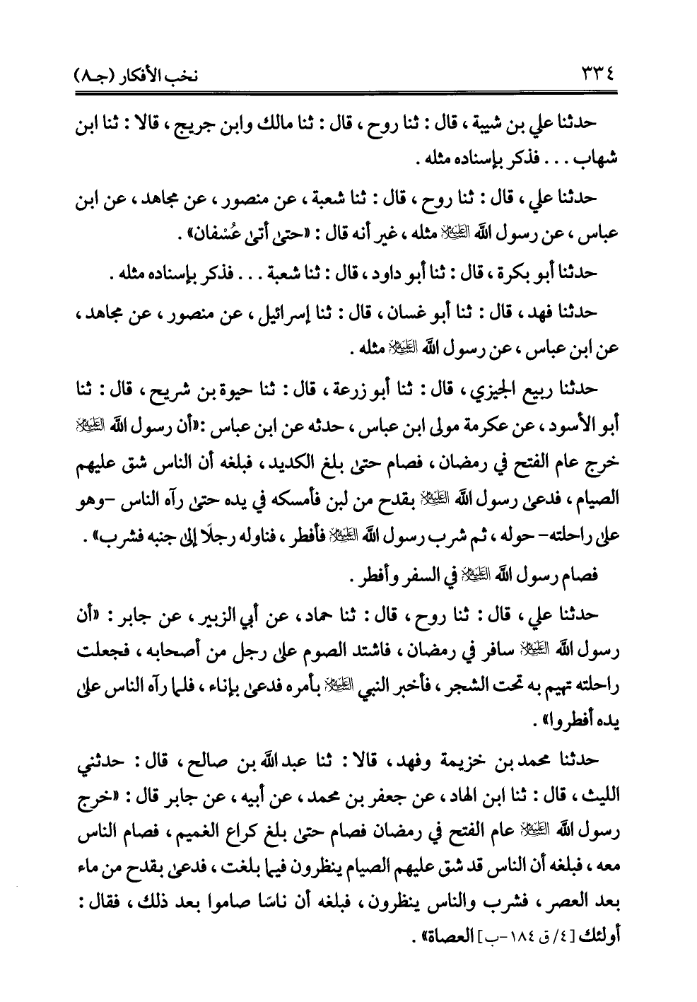 حدثنا محمد بن خزيمة وفهد، قالا: ثنا عبد الله بن صالح، قال: حدثني الليث، قال: ثنا ابن الهاد، عن جعفر بن محمَّد، عن أبيه، عن جابر قال: "خرج رسول الله - عليه السلام - عام الفتح في رمضان فصام حتى بلغ كراع الغميم، فصام الناس معه، فبلغه أن الناس قد شق عليهم الصيام ينظرون فيما بلغت، فدعى بقدح من ماء بعد العصر، فشرب والناس ينظرون، فبلغه أن ناسًا صاموا بعد ذلك، فقال: أولئك العصاة".