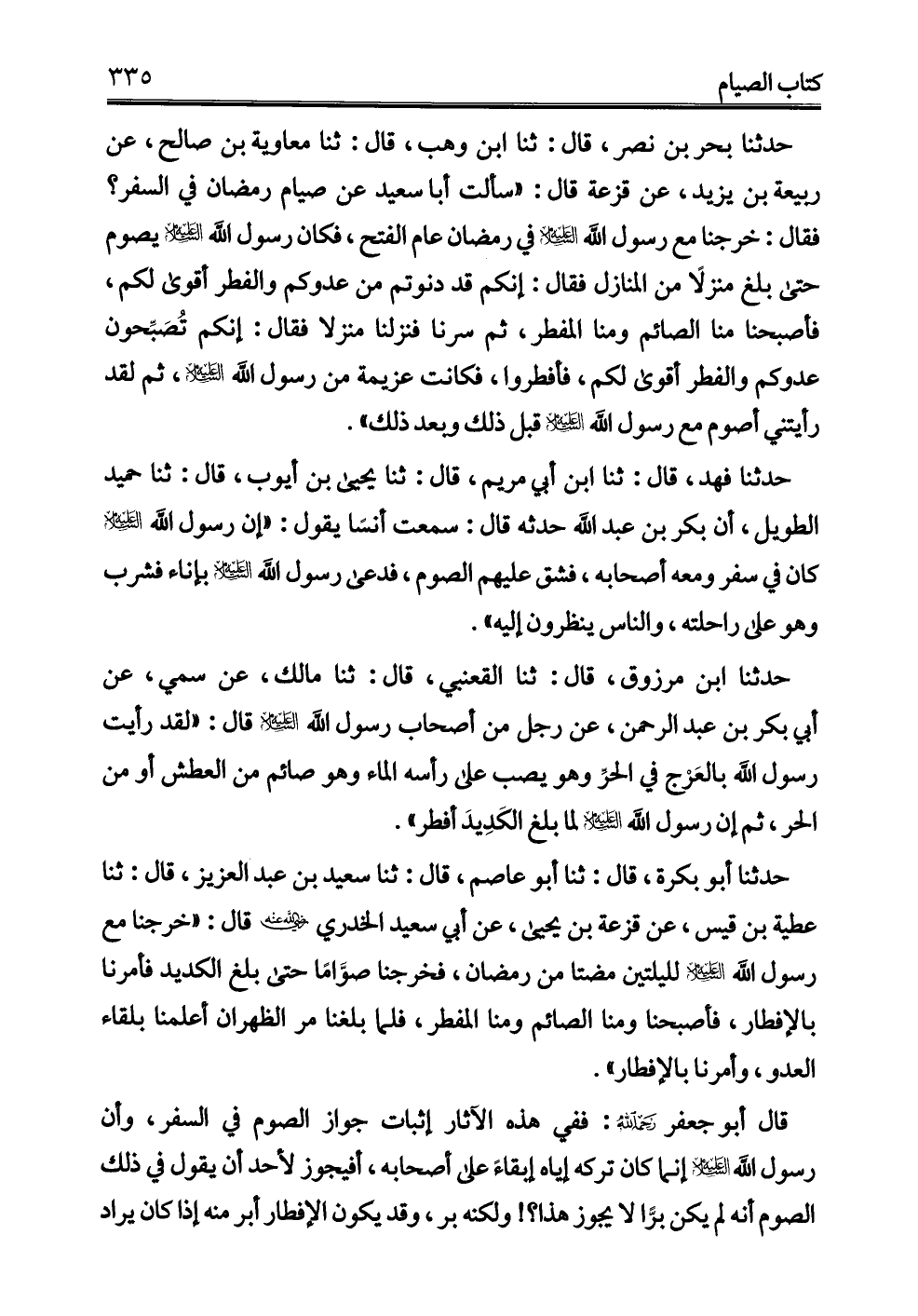 حدثنا بحر بن نصر، قال: ثنا ابن وهب، قال: ثنا معاوية بن صالح، عن ربيعة بن يزيد، عن قزعة قال: "سألت أبا سعيد عن صيام رمضان في السفر؟ فقال: خرجنا مع رسول الله - عليه السلام - في رمضان عام الفتح، فكان رسول الله - عليه السلام - يصوم حتى بلغ منزلًا من المنازل فقال: إنكم قد دنوتم من عدوكم والفطر أقوى لكم، فأصبحنا منا الصائم ومنا المفطر، ثم سرنا فنزلنا منزلا فقال: إنكم تُصَبِّحون عدوكم والفطر أقوى لكم، فأفطروا، فكانت عزيمة من رسول الله - عليه السلام -، ثم لقد رأيتني أصوم مع رسول الله - عليه السلام - قبل ذلك وبعد ذلك".
