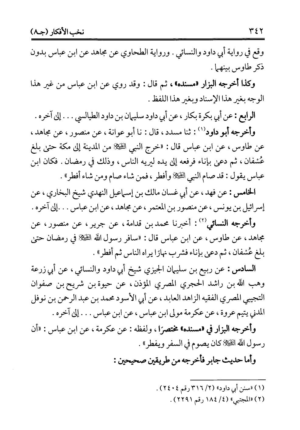 وأخرجه أبو داود (¬1): ثنا مسدد، قال: نا أبو عوانة، عن منصور، عن مجاهد، عن طاوس، عن ابن عباس قال: "خرج النبي - عليه لسلام - من المدينة إلى مكة حتى بلغ عُسْفان، ثم دعى بإناء فرفعه إلى يده ليريه الناس، وذلك في رمضان. فكان ابن عباس يقول: قد صام النبي - عليه السلام - وأفطر، فمن شاء صام ومن شاء أفطر".