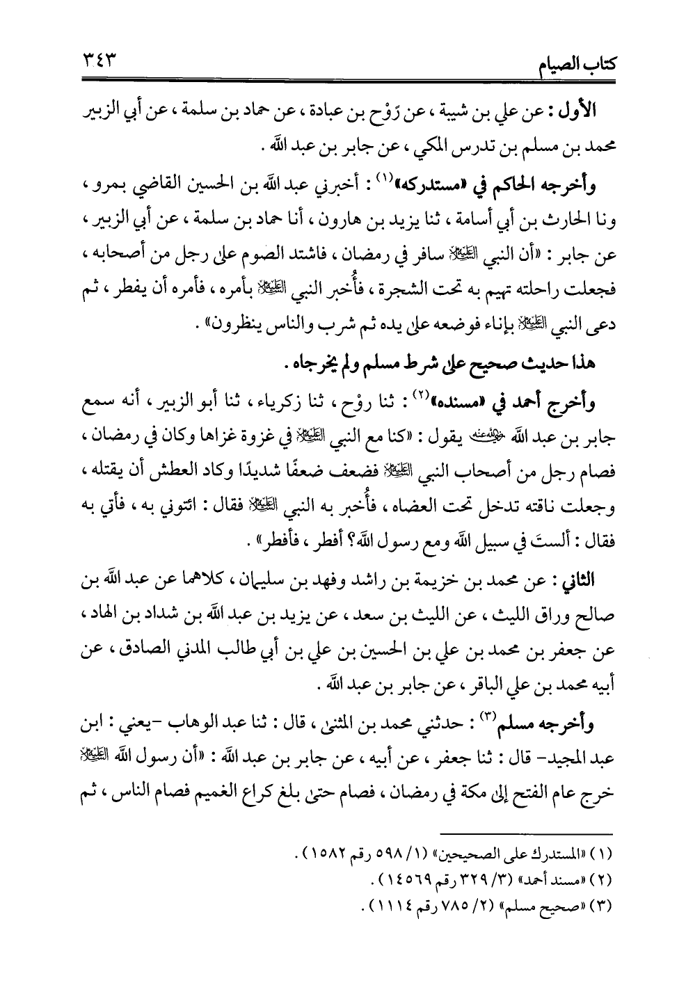 وأخرجه الحكم في "مستدركه" (¬1): أخبرني عبد الله بن الحسن القاضي بمرو، ونا الحارث بن أبي أسامة، ثنا يزيد بن هارون، أنا حماد بن سلمة، عن أبي الزبير، عن جابر: "أن النبي - عليه السلام - سافر في رمضان، فاشتد الصوم على رجل من أصحابه، فجعلت راحلته تهيم به تحت الشجرة، فأُخبر النبي - عليه السلام - بأمره، فأمره أن يفطر، ثم دعى النبي - عليه السلام - بإناء فوضعه على يده ثم شرب والناس ينظرون".