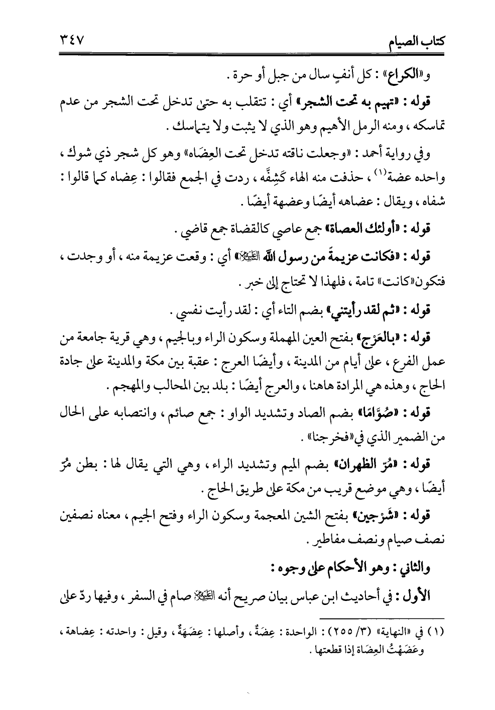 والثاني: وهو الأحكام على وجوه: الأول: في أحاديث ابن عباس بيان صريح أنه - عليه السلام - صام في السفر، وفيها ردّ على