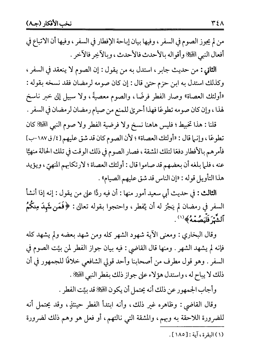 الثاني: من حديث جابر، استدل به من يقول: إن الصوم لا ينعقد في السفر، وكذلك استدل به ابن حزم حتى قال: إن كان صومه لرمضان فقد نسخه بقوله: "أولئك العصاة" وصار الفطر فرضًا، والصوم معصيةً، ولا سبيل إلى خبر ناسخ لهذا، وإن كان صومه تطوعًا فهذا أحرى للمنع من صيام رمضان لرمضان في السفر.
