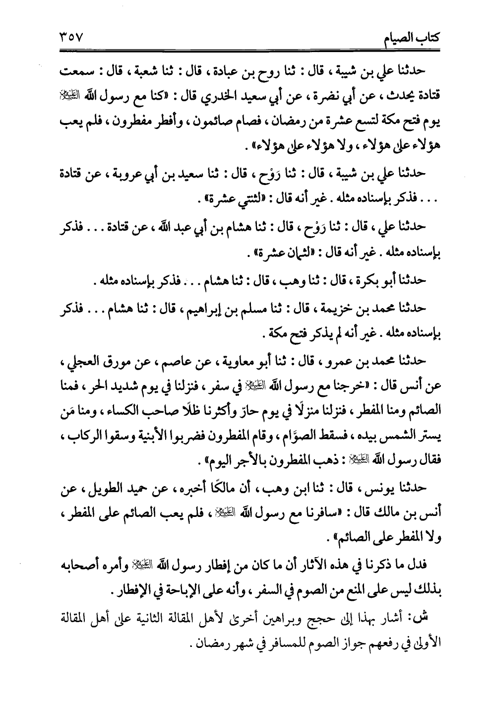 حدثنا علي بن شيبة، قال: ثنا روح بن عبادة، قال: ثنا شعبة، قال: سمعت قتادة يحدث، عن أبي نضرة، عن أبي سعيد الخدري قال: "كنا مع رسول الله - عليه السلام - يوم فتح مكة لتسع عشرة من رمضان، فصام صائمون، وأفطر مفطرون، فلم يعب هؤلاء على هؤلاء، ولا هؤلاء على هؤلاء".