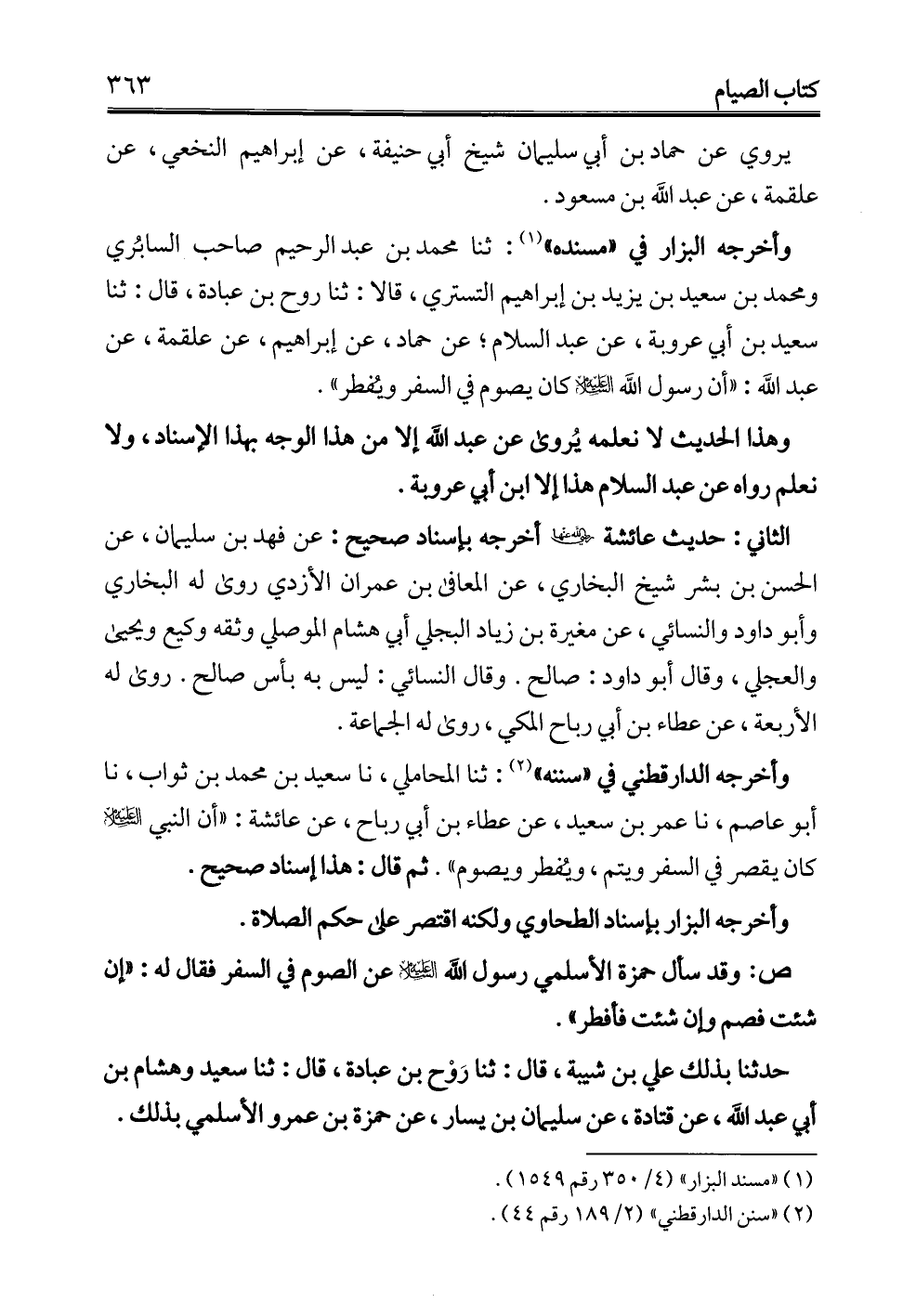 وأخرجه البزار في "مسنده" (¬1): ثنا محمَّد بن عبد الرحيم صاحب السابُري ومحمد بن سعيد بن يزيد بن إبراهيم التستري، قالا: ثنا روح بن عبادة، قال: ثنا سعيد بن أبي عروبة، عن عبد السلام؛ عن حماد، عن إبراهيم، عن علقمة، عن عبد الله: "أن رسول الله - عليه السلام - كان يصوم في السفر ويُفطر".