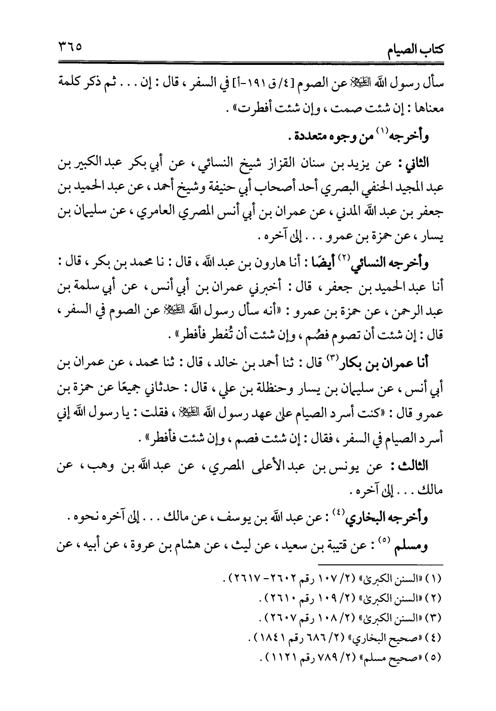 الثاني: عن يزيد بن سنان القزاز شيخ النسائي، عن أبي بكر عبد الكبير بن عبد المجيد الحنفي البصري أحد أصحاب أبي حنيفة وشيخ أحمد، عن عبد الحميد بن جعفر بن عبد الله المدني، عن عمران بن أبي أنس المصري العامري، عن سليمان بن يسار، عن حمزة بن عمرو ... إلى آخره.