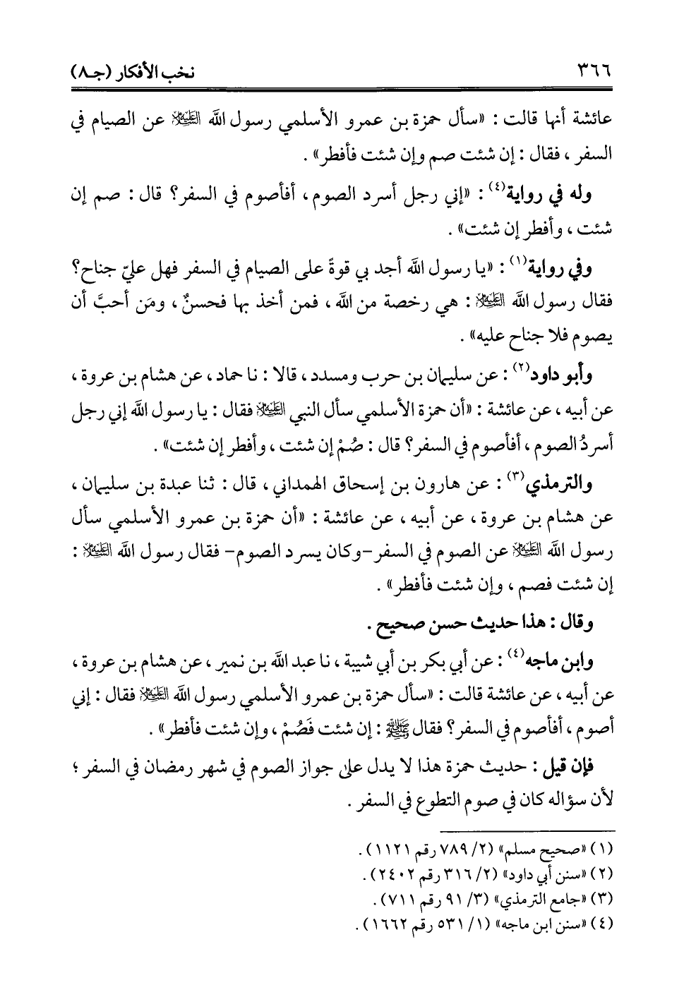 وأبو داود (¬2): عن سليمان بن حرب ومسدد، قالا: نا حماد، عن هشام بن عروة، عن أبيه، عن عائشة: "أن حمزة الأسلمي سأل النبي - عليه السلام - فقال: يا رسول الله إني رجل أسردُ الصوم، أفأصوم في السفر؟ قال: صُمْ إن شئت، وأفطر إن شئت". والترمذي (¬3): عن هارون بن إسحاق الهمداني، قال: ثنا عبدة بن سليمان، عن هشام بن عروة، عن أبيه، عن عائشة: "أن حمزة بن عمرو الأسلمي سأل رسول الله - عليه السلام - عن الصوم في السفر -وكان يسرد الصوم- فقال رسول الله - عليه السلام -: إن شئت فصم، وإن شئت فأفطر".